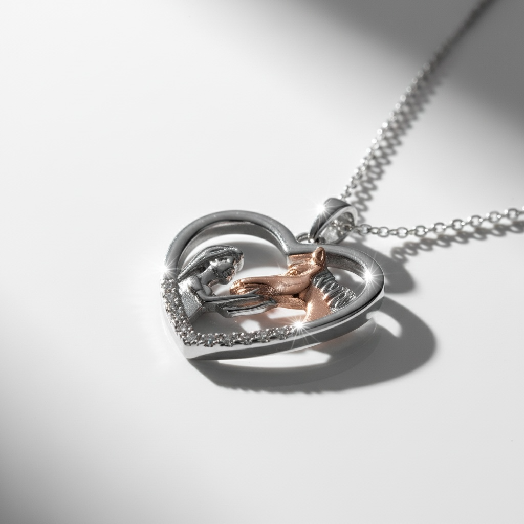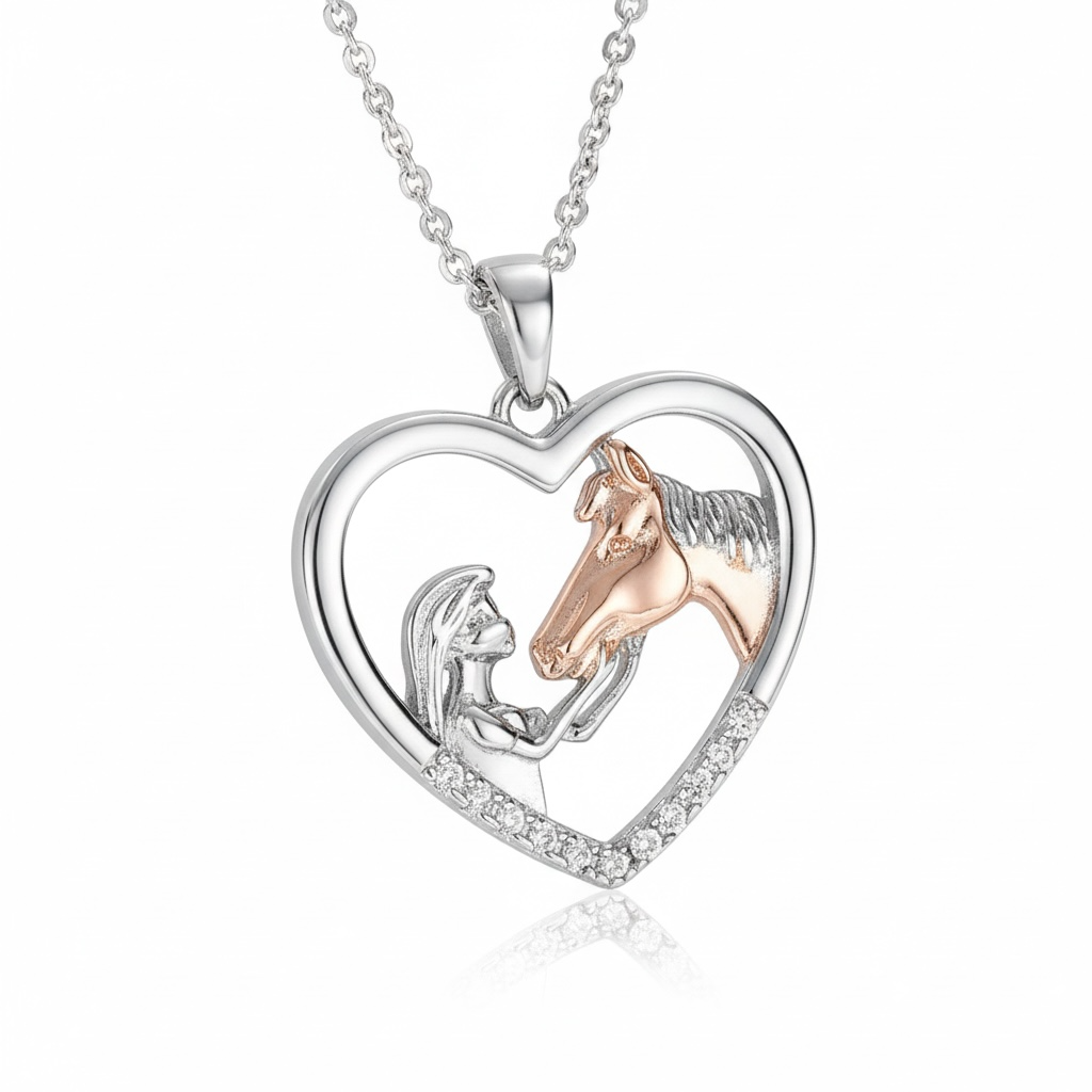 Smuk og betydningsfuld halskæde med hjertevedhæng, der forestiller en pige og en hest – et perfekt smykke til dig, der elsker heste. Designet symboliserer det særlige bånd mellem rytter og hest og gør halskæden både personlig og elegant.