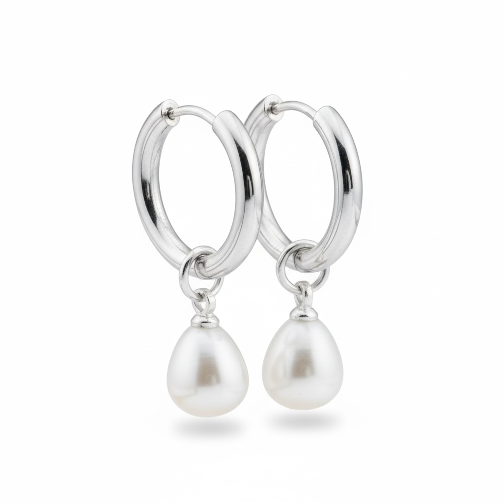 Enkle og elegante hoop-øreringe i rustfrit stål med en klassisk, hængende perle. Det minimalistiske design kombinerer et moderne udtryk med tidløs elegance og gør øreringene velegnede til både hverdag og fest.