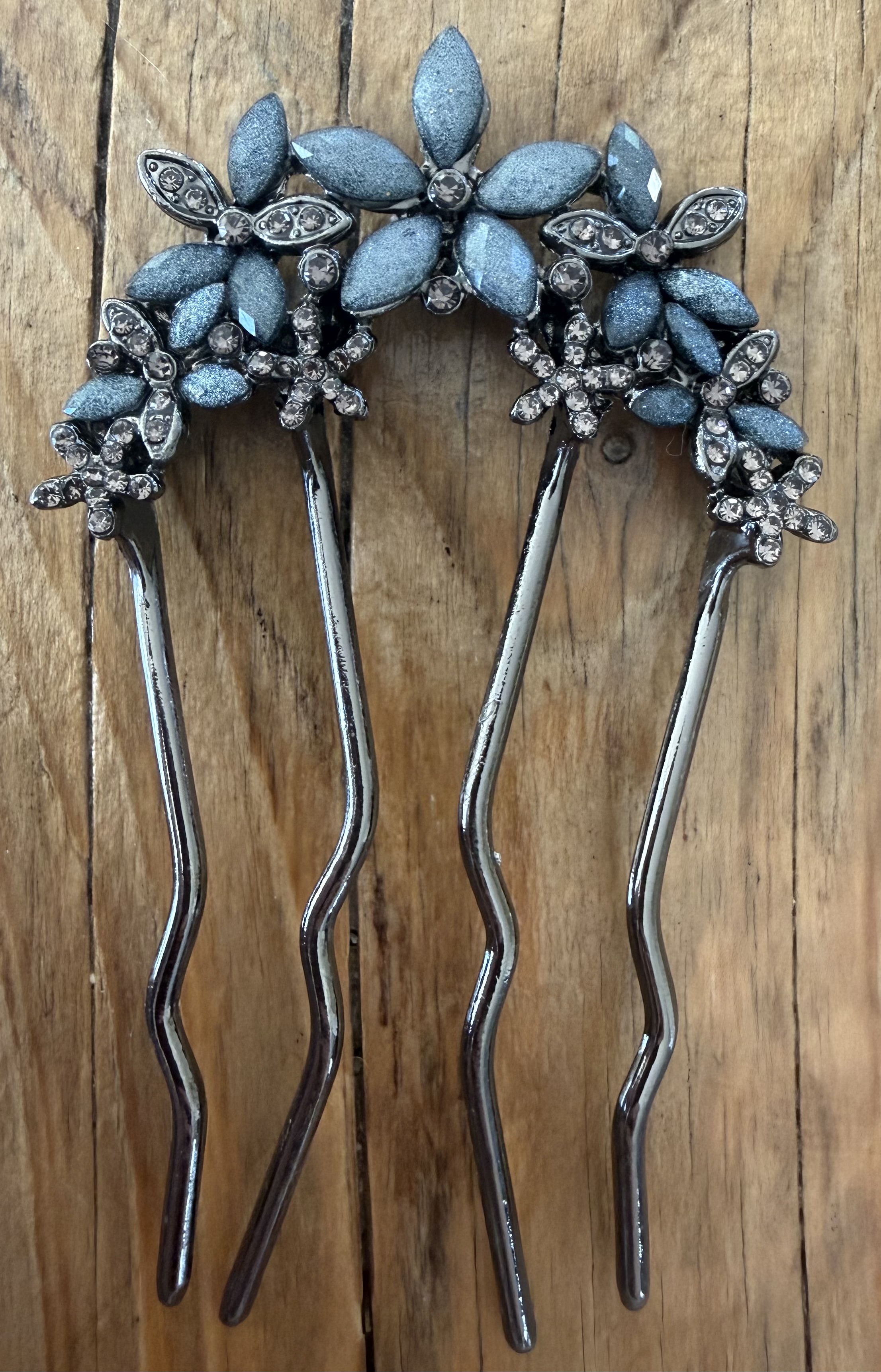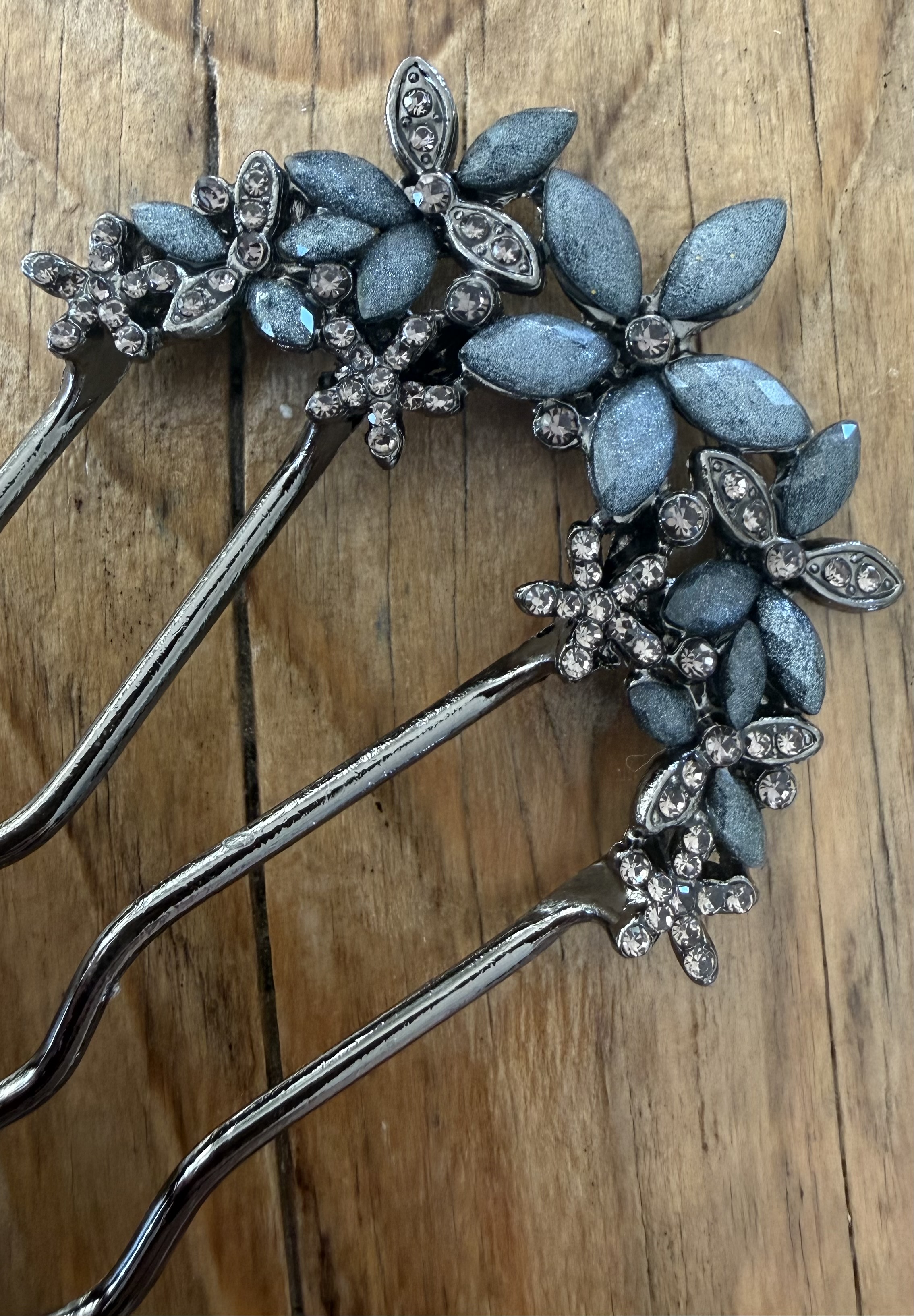 Elegant hårnåle i blå finish, dekoreret med detaljerede blomster og fine funklende sten. Det dybe, sofistikerede udtryk giver et eksklusivt og moderne look, som passer perfekt til både konfirmation, bryllup og andre festlige begivenheder.