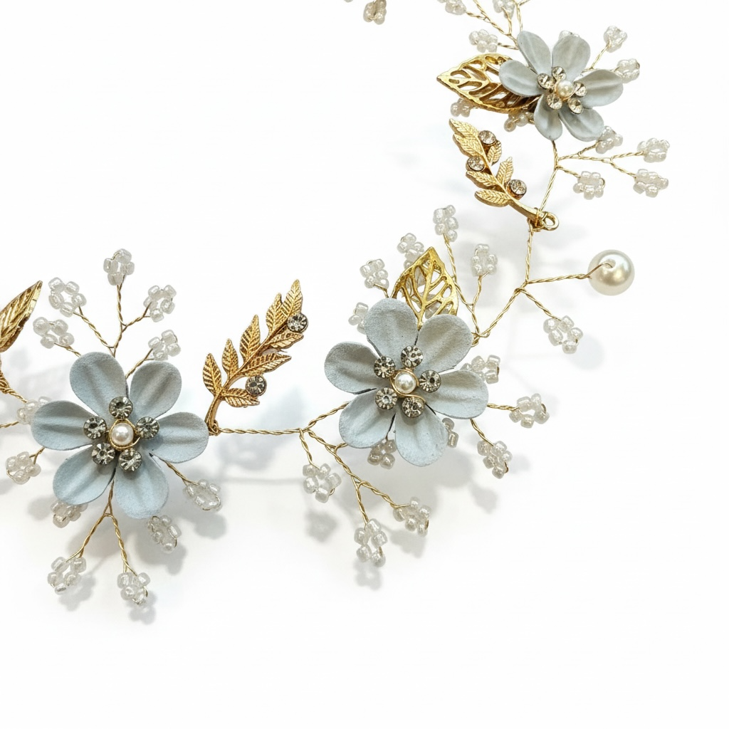 Smukt og romantisk hårsmykke med fine blomster i sarte blå nuancer, elegante guldfarvede blade og dekorative perler. Det lette og fleksible design gør det nemt at forme efter frisuren og giver et eksklusivt og feminint udtryk – perfekt til både konfirmation, bryllup og andre festlige begivenheder.