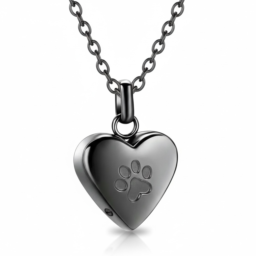 Sort Stainless Steel Aske-Halskæde – Hjerte med Poteaftryk (Til Kæledyrsminder)