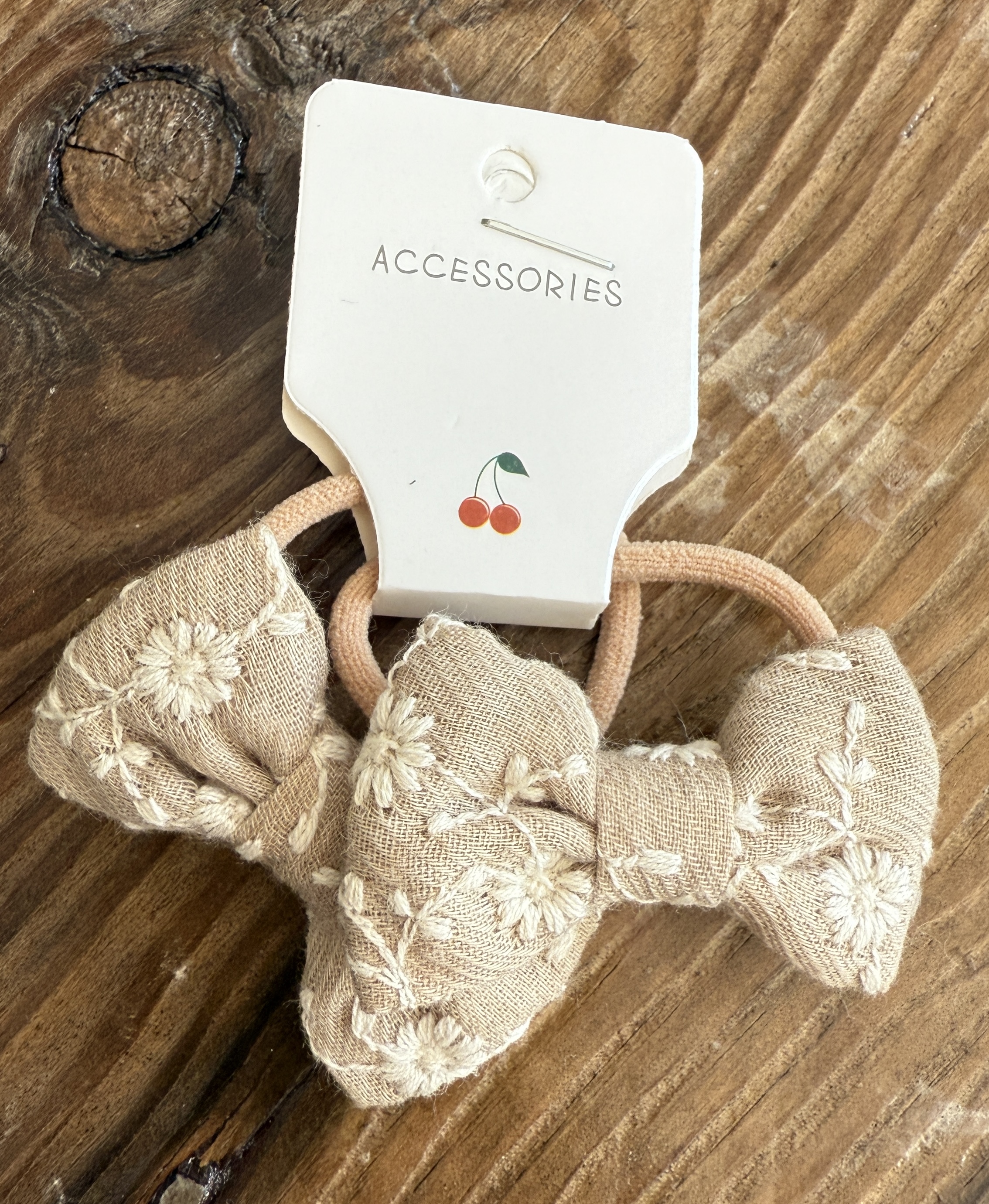 2 stk. Søde sløjfe hårelastikker - Lysbrun med hvide blomster
