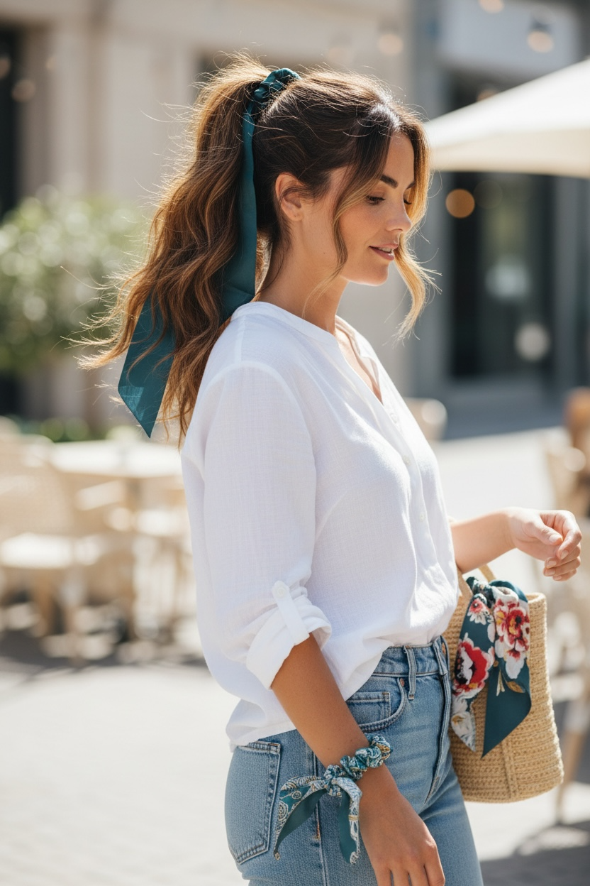 Smukt scrunchie-sæt i elegant grønne nuancer. Sættet består af tre satin-hårelastikker: ét med mønster, ét ensfarvet og ét med blomsterprint. Hver scrunchie har et let, flydende tørklæde-bånd, der giver frisuren et feminint og stilfuldt udtryk.