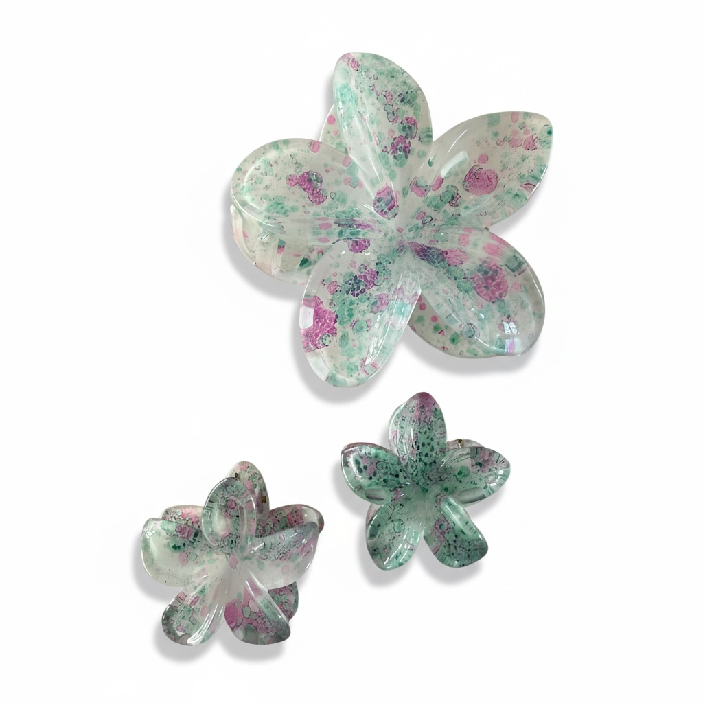 Smukt og feminint hårklemme-sæt i transparent design med fine lilla og grønne detaljer.