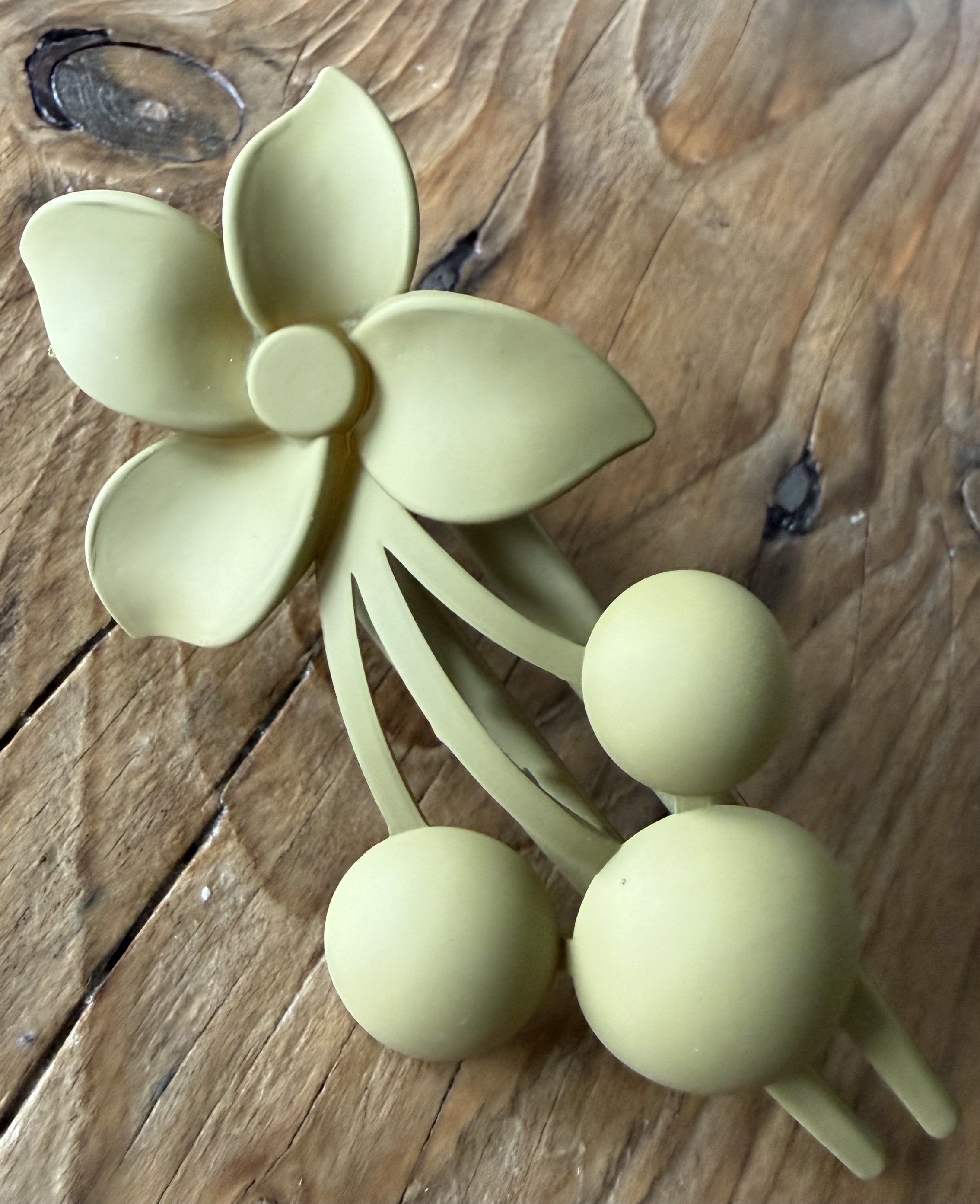 Charmerende hårspænde med blomsterdesign og dekorative kugledetaljer. Den bløde, støvede grønne nuance giver et roligt og stilrent udtryk, mens de runde former tilfører et legende og feminint præg.