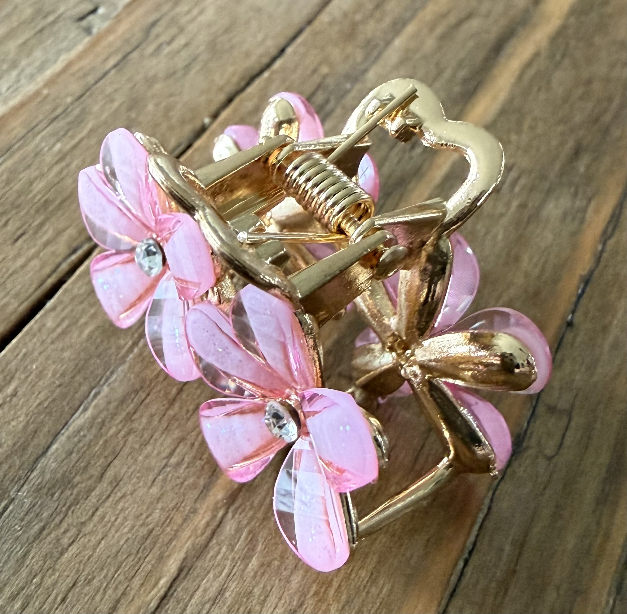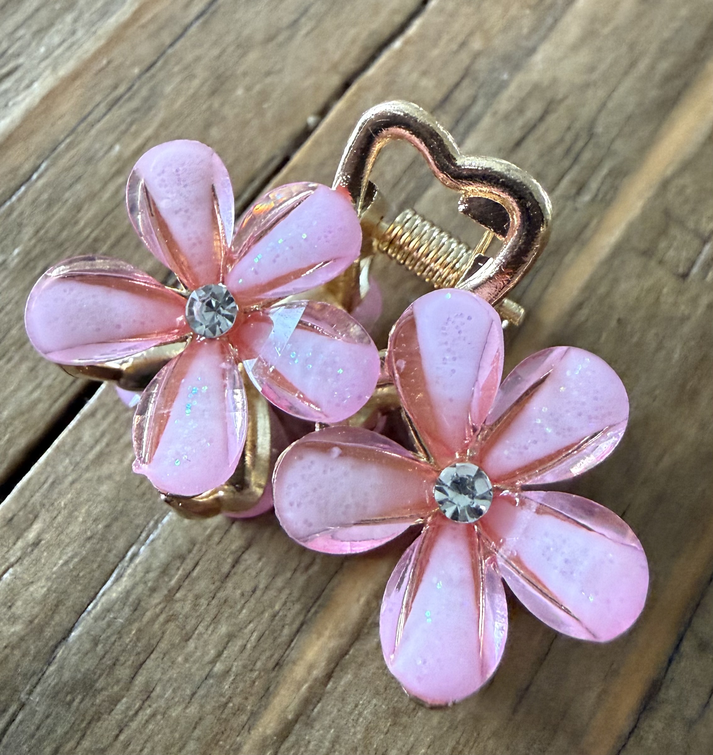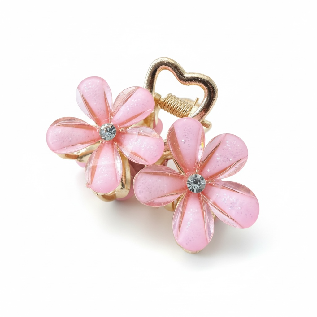Sødt og feminint lille hårspænde med fire fine blomster og funklende sten i midten. De let transparente kronblade med diskret glimmer giver et blødt og romantisk udtryk, mens den gyldne detalje formet som et hjerte tilfører et charmerende touch.