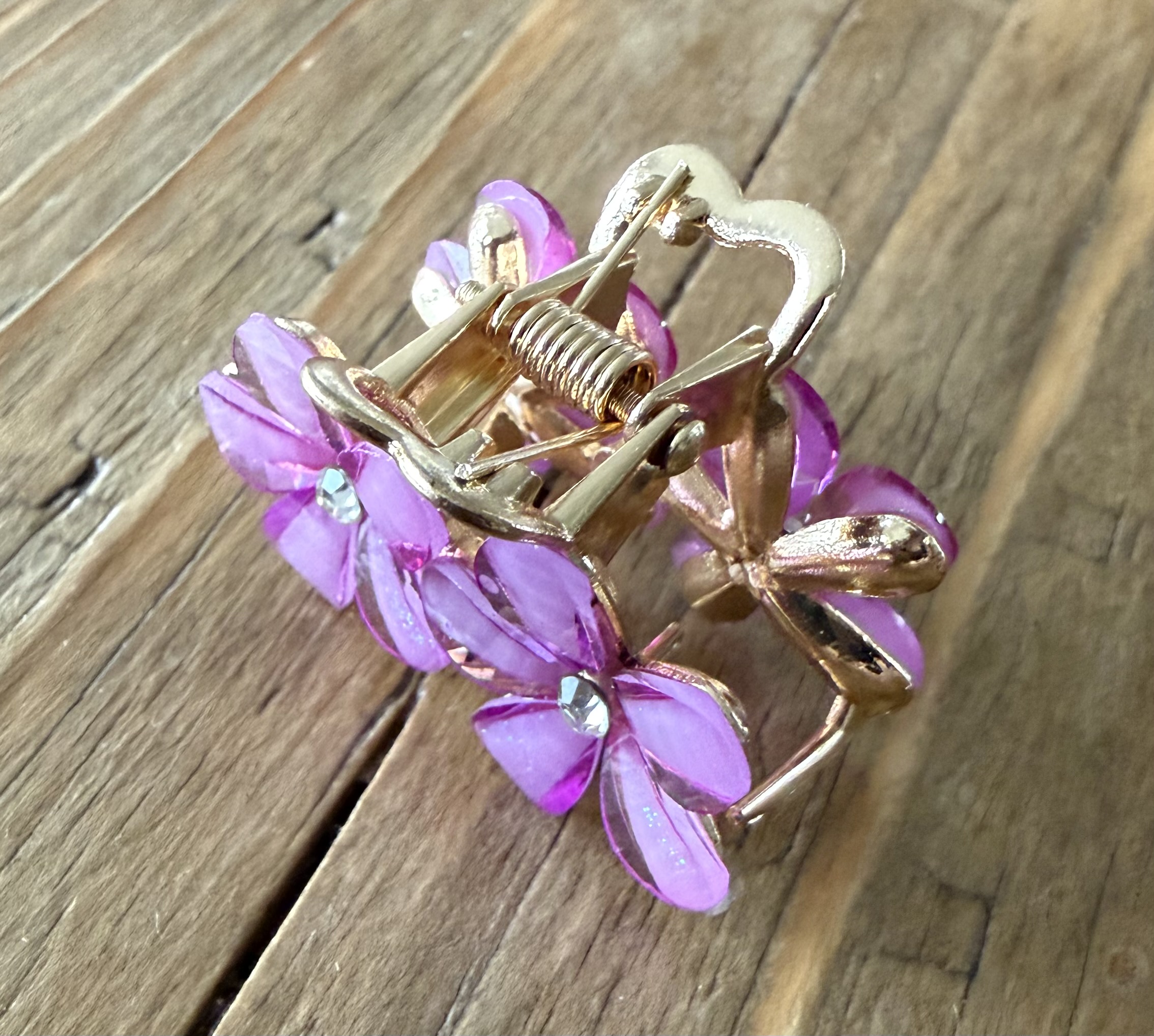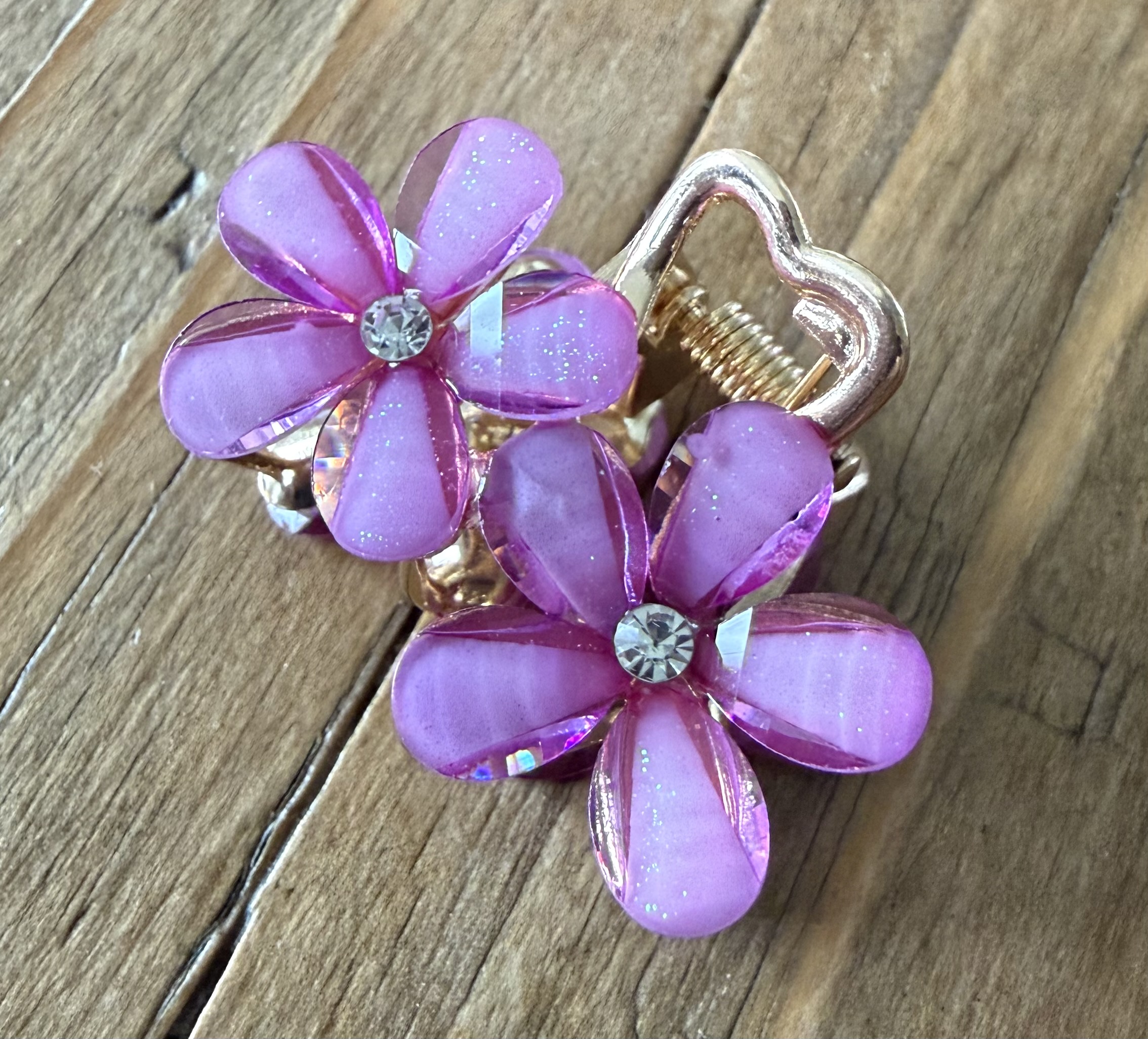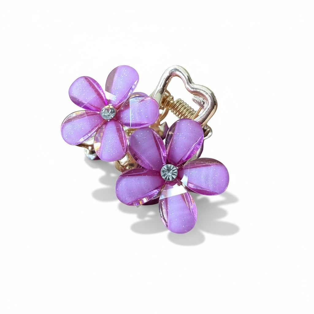 Elegant og dekorativt lille hårspænde med fire smukke blomster og funklende sten i midten. De transparente kronblade med diskret glimmer giver et dybt og eksklusivt udtryk, mens de gyldne detaljer og det fine hjerte tilfører et feminint og romantisk touch.