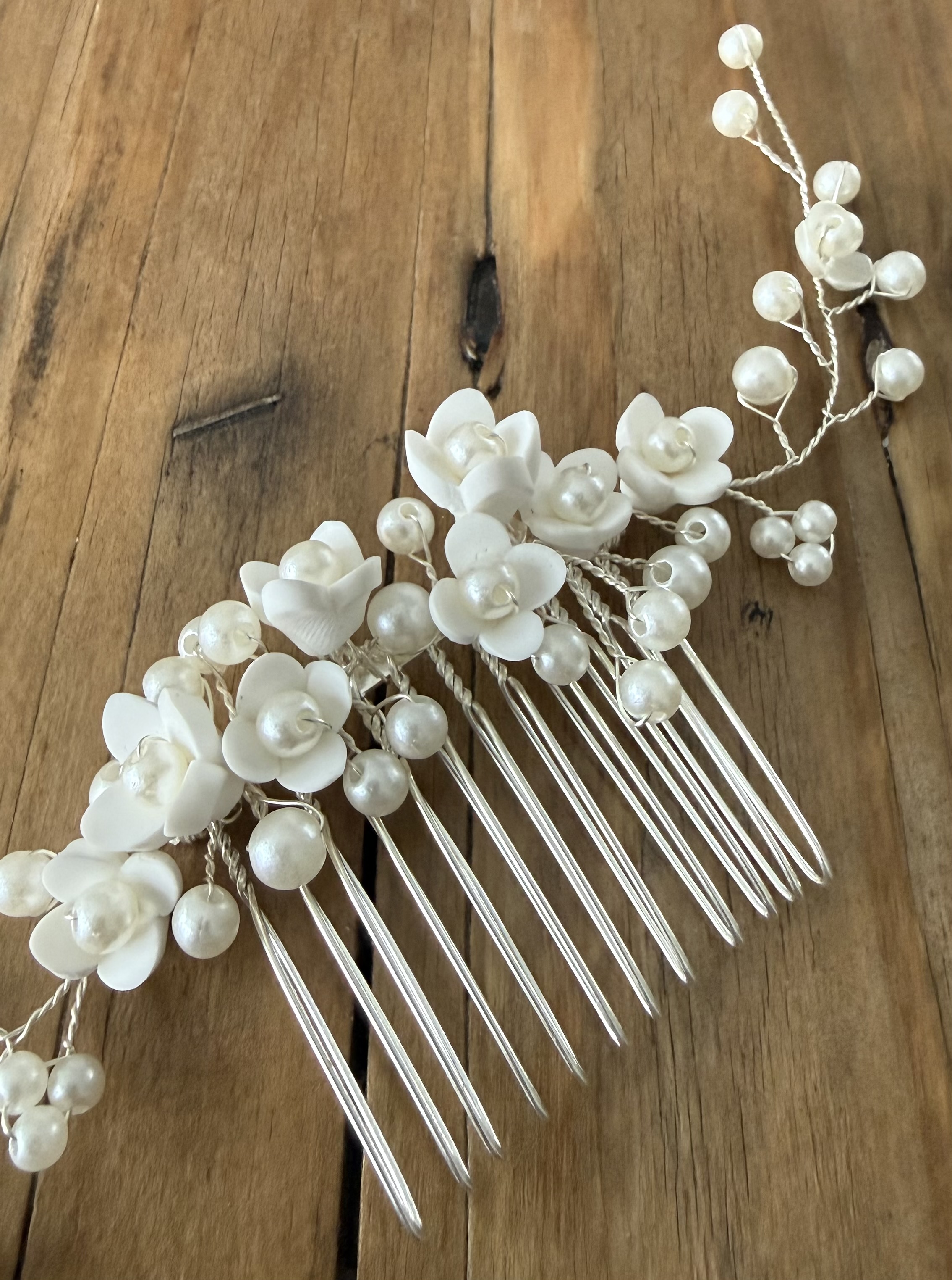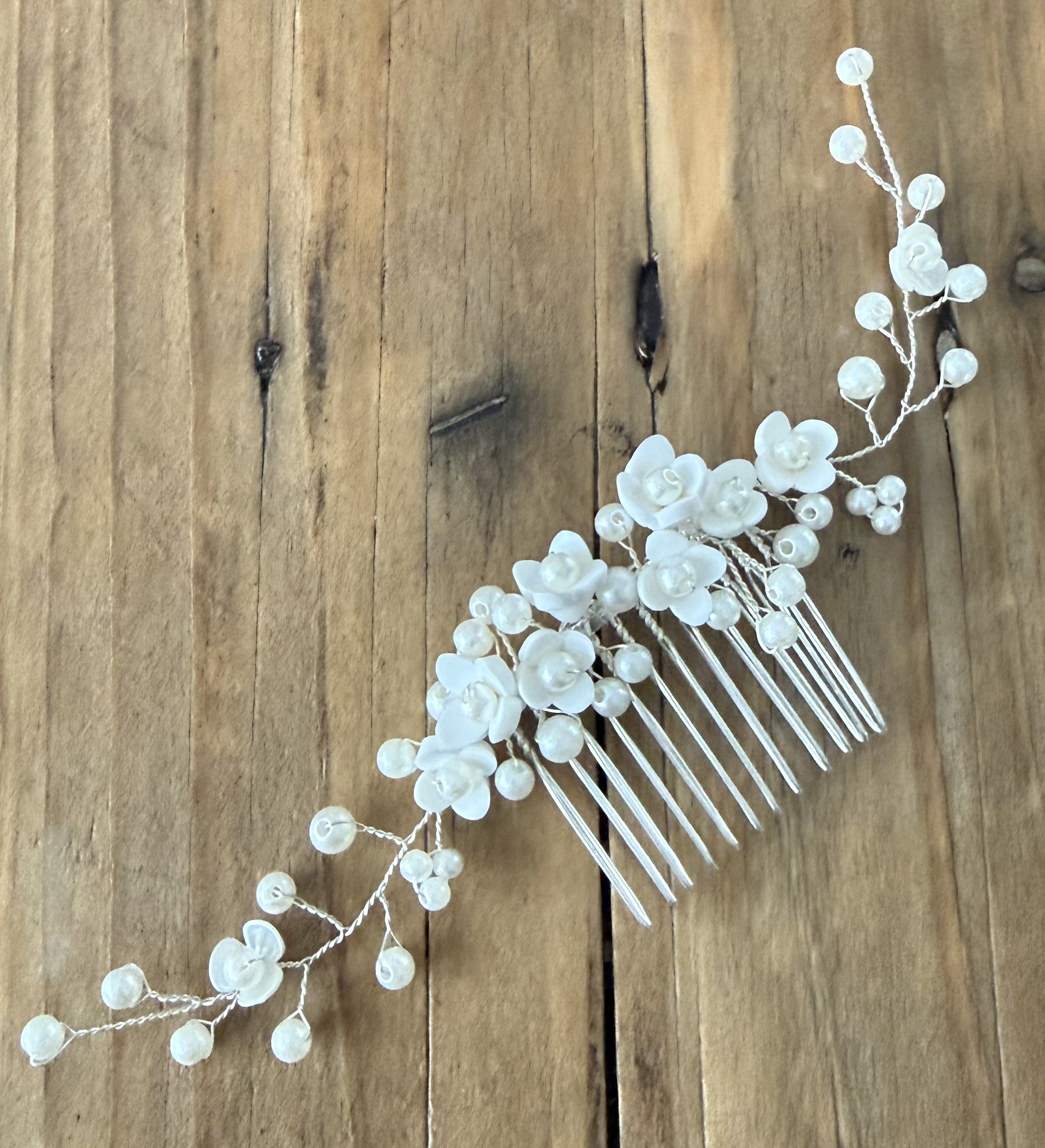 Smukt og romantisk hårsmykke dekoreret med fine blomster og perler i et let og feminint design. Smykket er monteret på en diskret kam, som gør det nemt og sikkert at placere i håret.