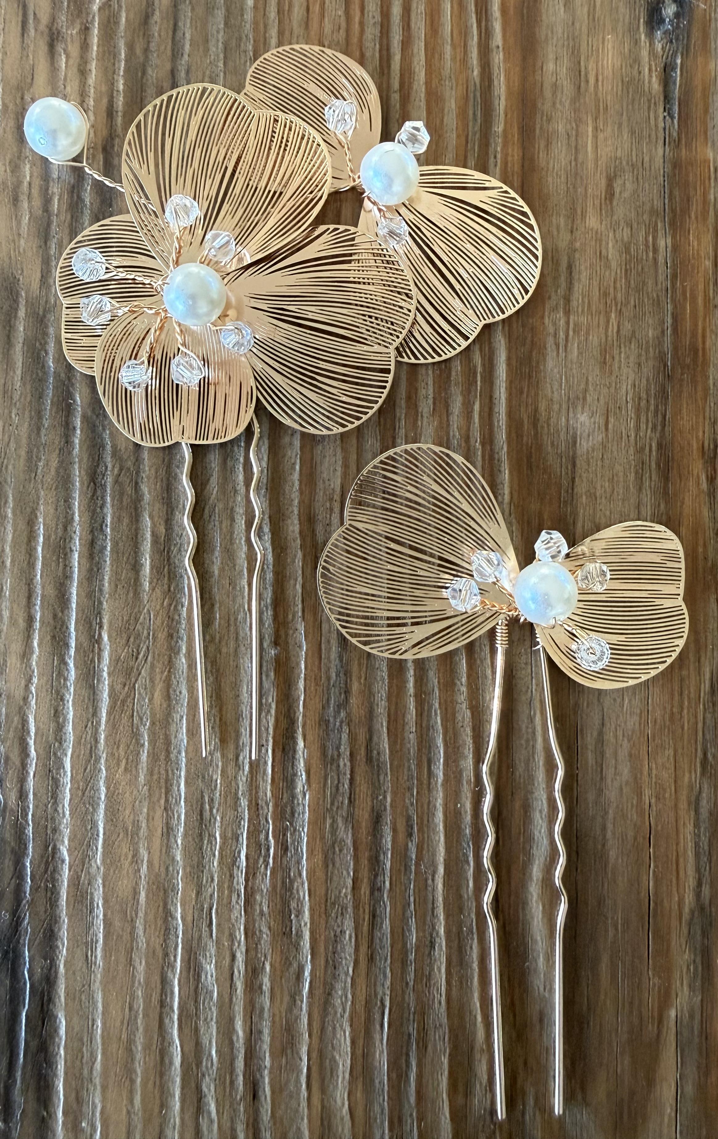 Dette fine sæt hårnåle giver et smukt, feminint og luksuriøst udtryk i håret. Blomsterne har en let og elegant form med glimtende detaljer, der fanger lyset flot – ideelt til både klassiske og moderne frisurer.