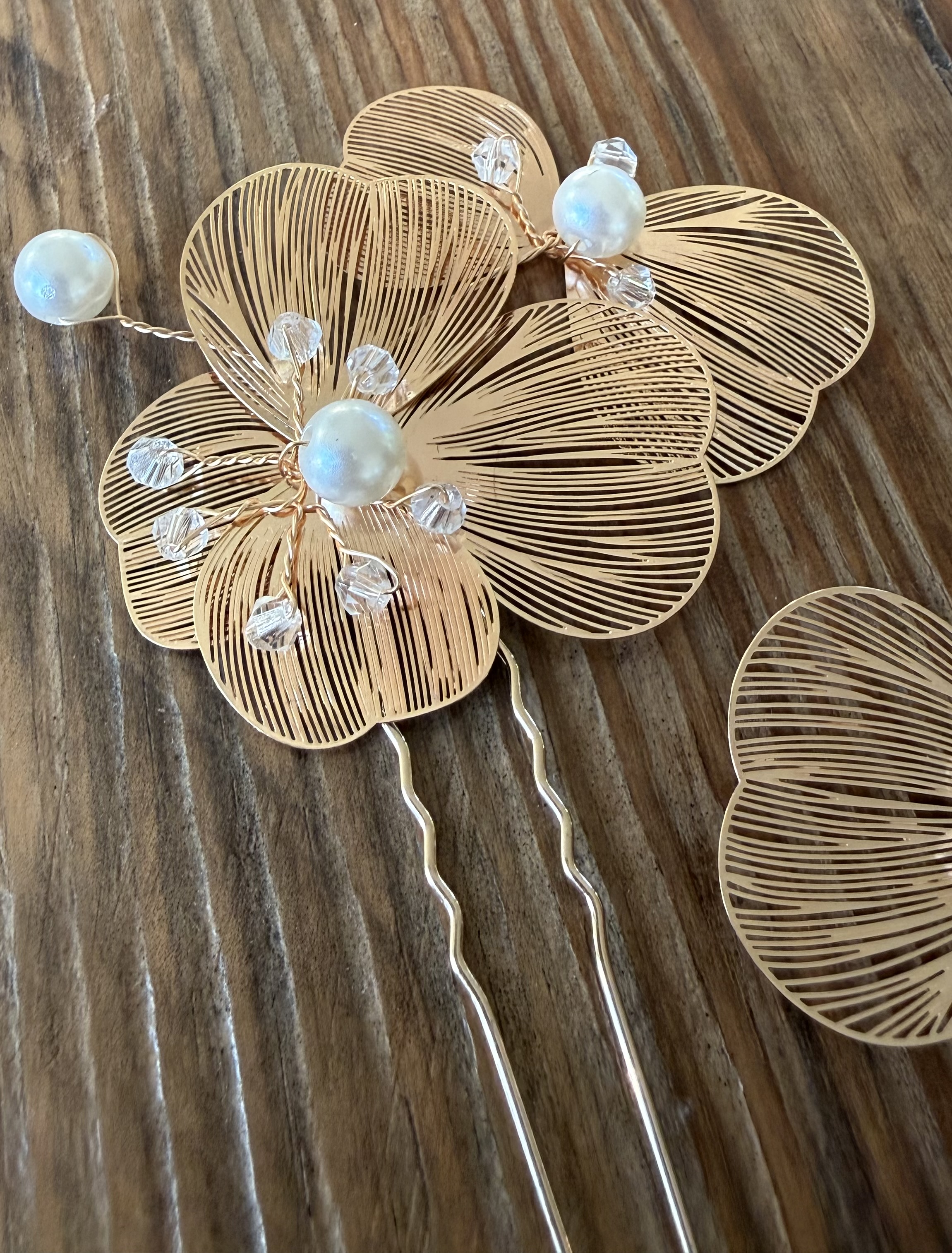 Smukke forgyldte hårnåle med blomsterdesign, perledetaljer og fine klare sten. Et elegant hårpynt-sæt, der passer perfekt til bryllup, konfirmation, fest og opsætninger, hvor du ønsker et eksklusivt og romantisk look.