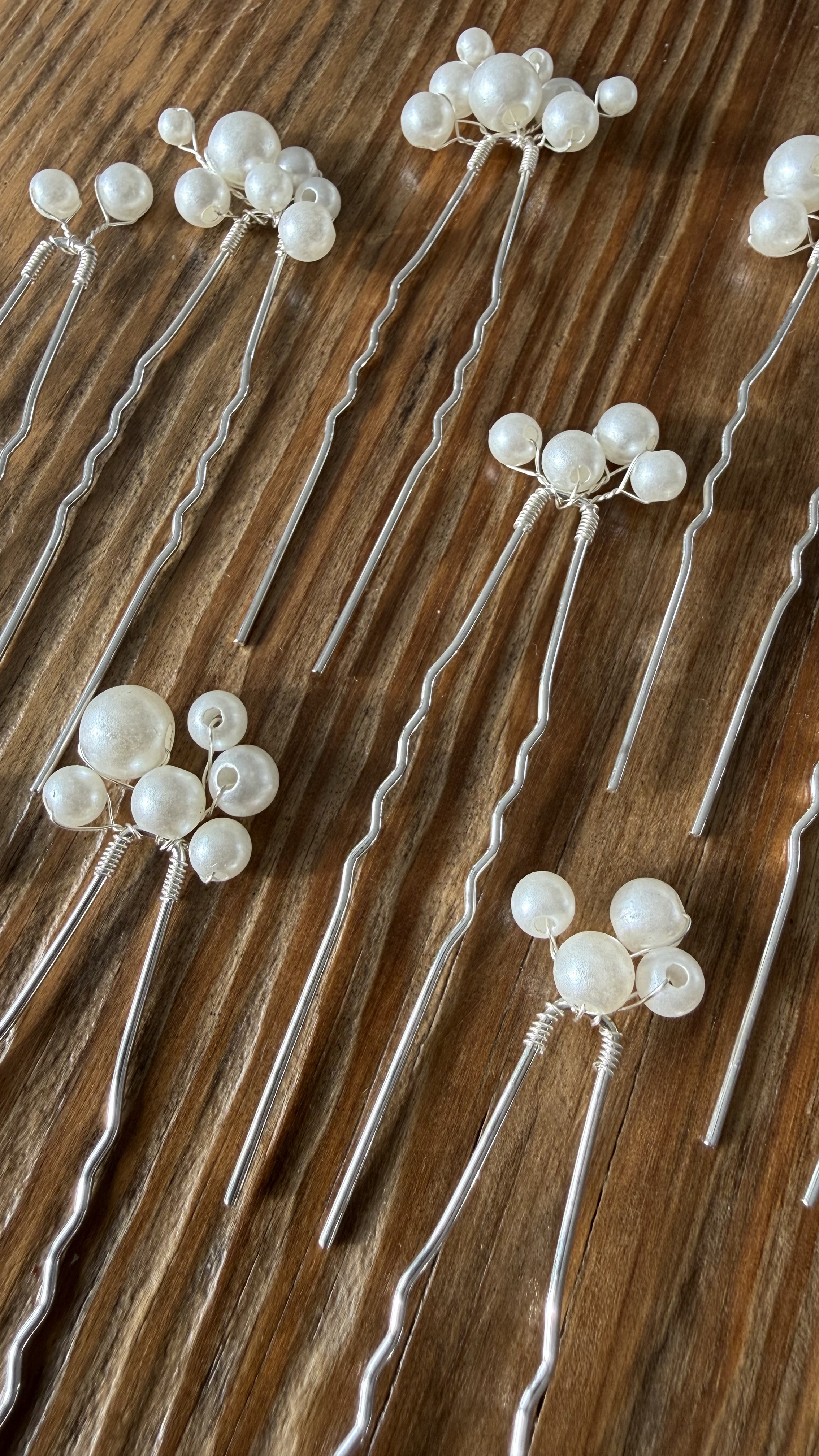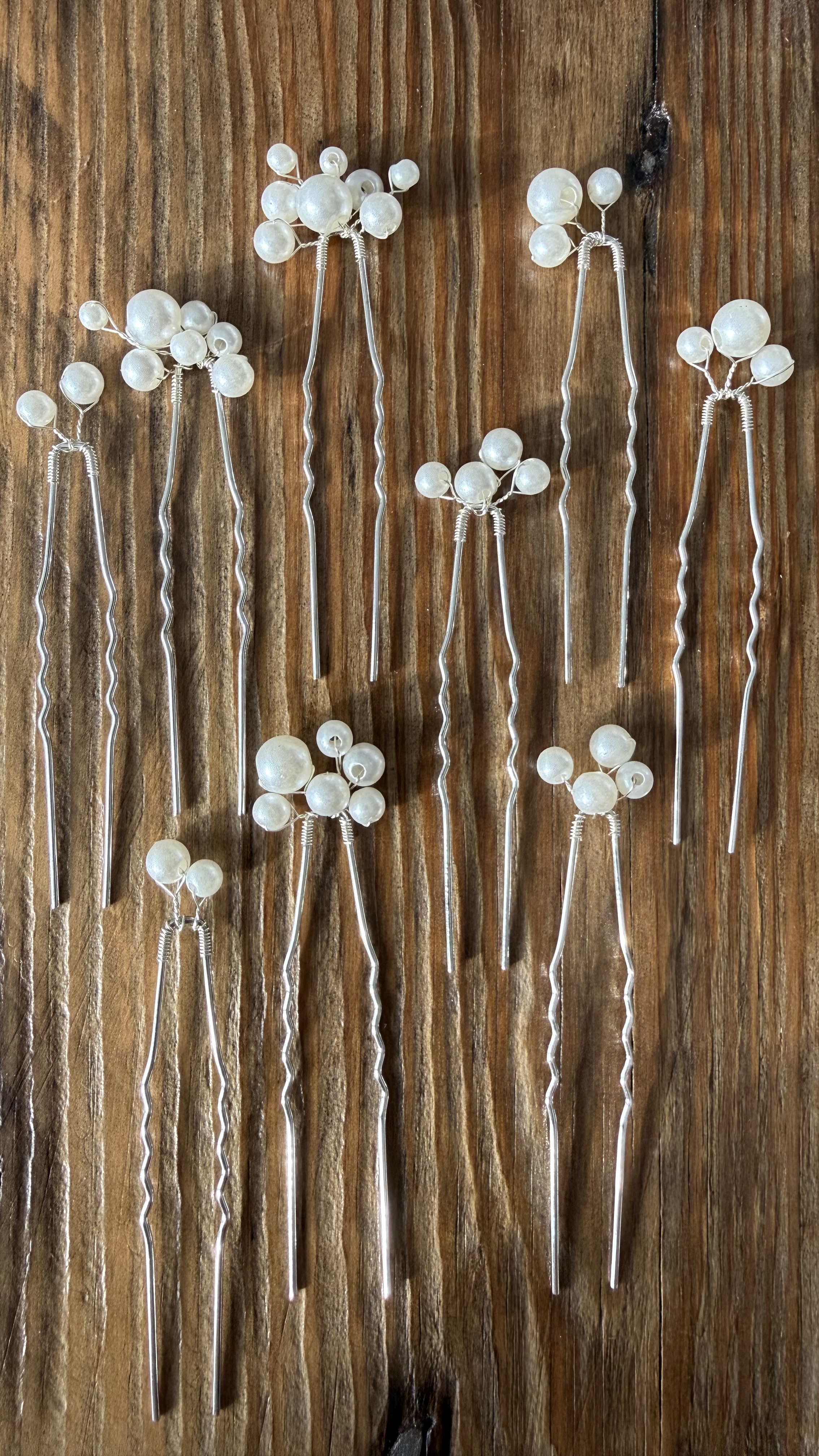 Smukt sæt med 9 elegante hårnåle dekoreret med hvide perler i forskellige størrelser. Det lette og romantiske design giver et feminint og stilrent udtryk, som passer perfekt til både konfirmation, bryllup og andre festlige anledninger.