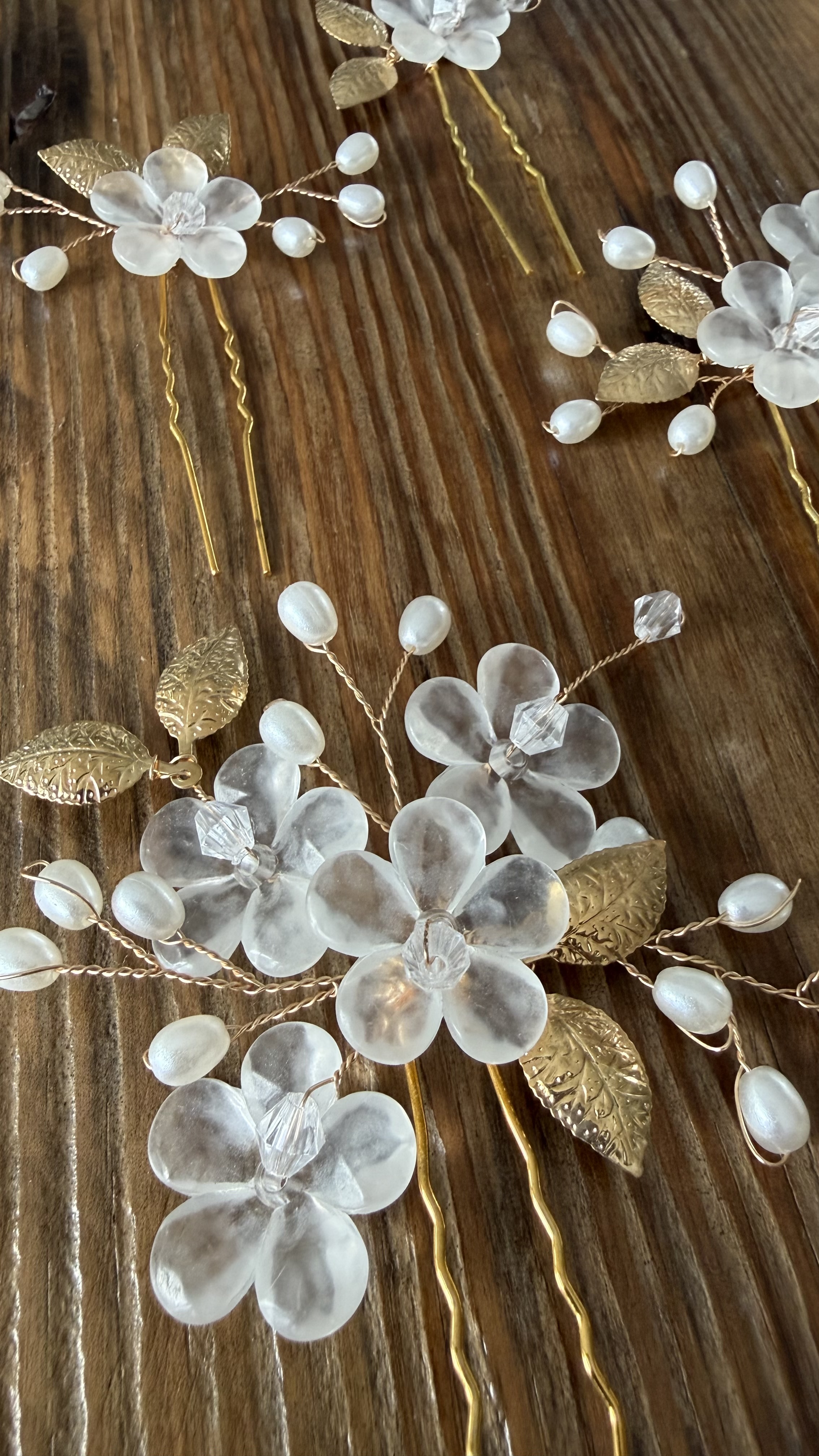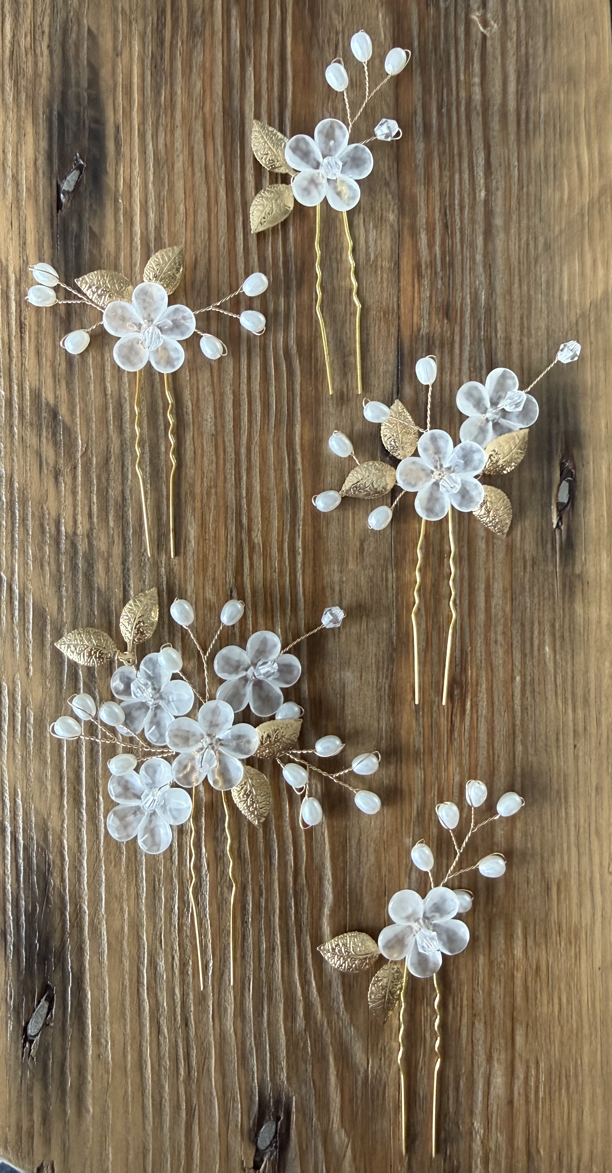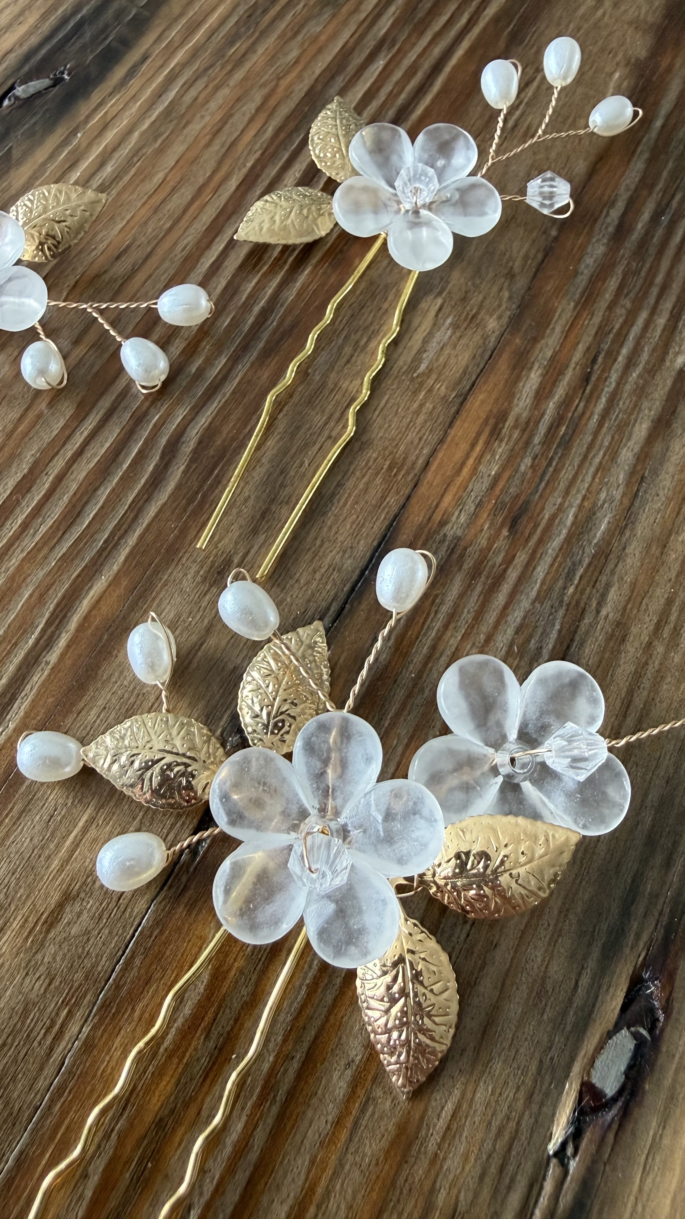 Smukt og feminint sæt hårnåle dekoreret med fine, transparente blomster, små perledetaljer og elegante guldfarvede blade. Det lette og romantiske design giver et eksklusivt og naturligt udtryk, som passer perfekt til både konfirmation, bryllup og andre festlige begivenheder.