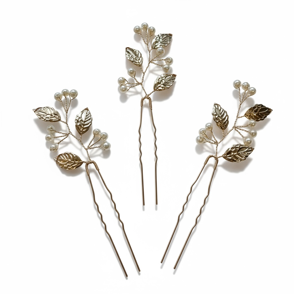 Forkæl dig selv med disse 3 stk. Forgyldte hårnåle, prydet med smukke hvide perler og forgyldte blade. Perfekte til brylluppet eller konfirmationen og til at fuldende din drømmende brudlook.