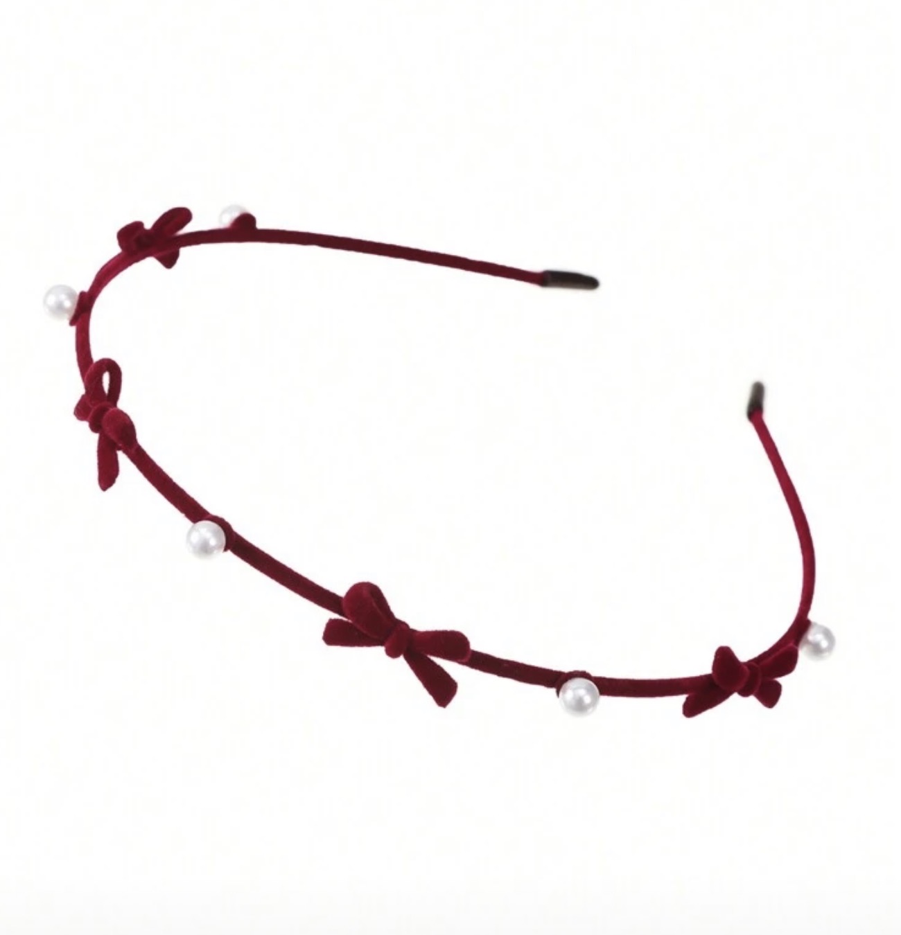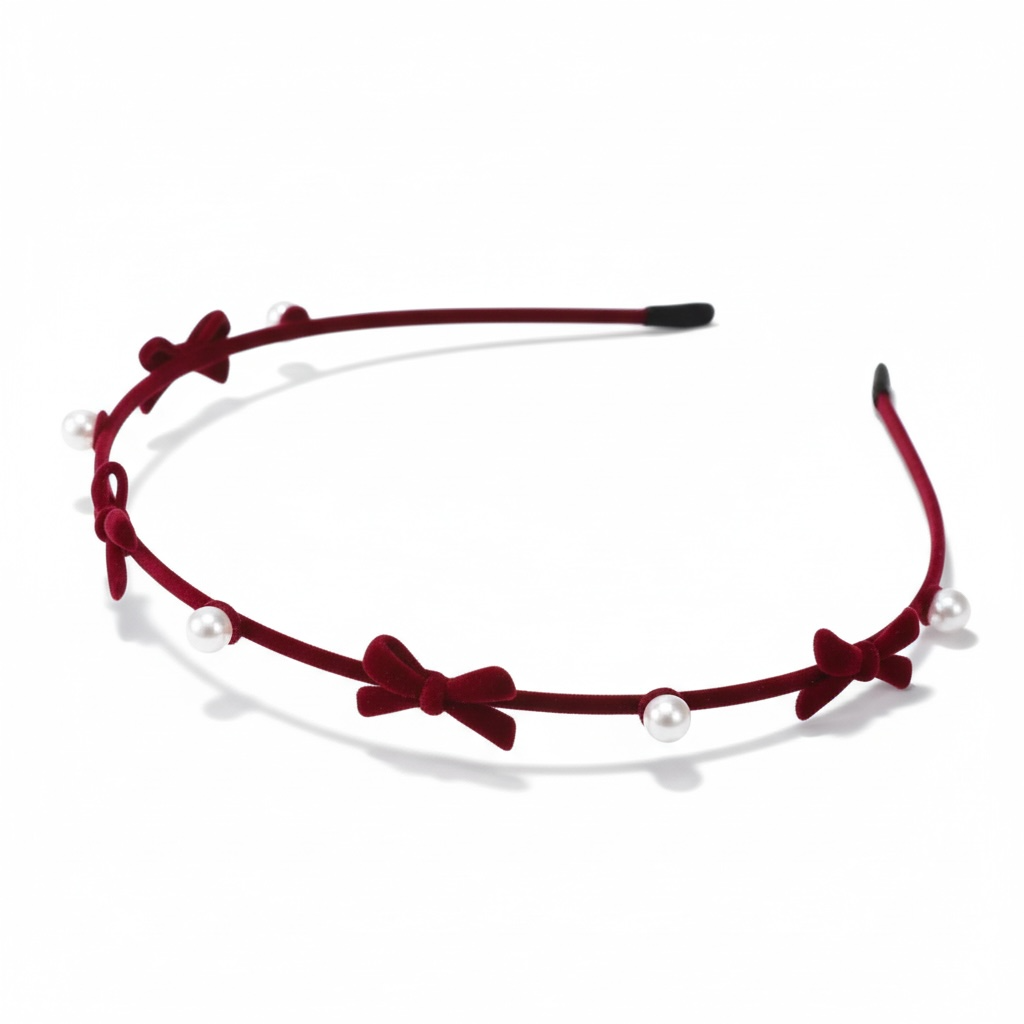 Tilfør dit look et strejf af romantik og elegance med dette fine hårbånd i blød rød velour. Hårbåndet er dekoreret med små sløjfer og delikate perler, der giver et sødt, stilfuldt og feminint udtryk – perfekt til både hverdag, fest og højtider.