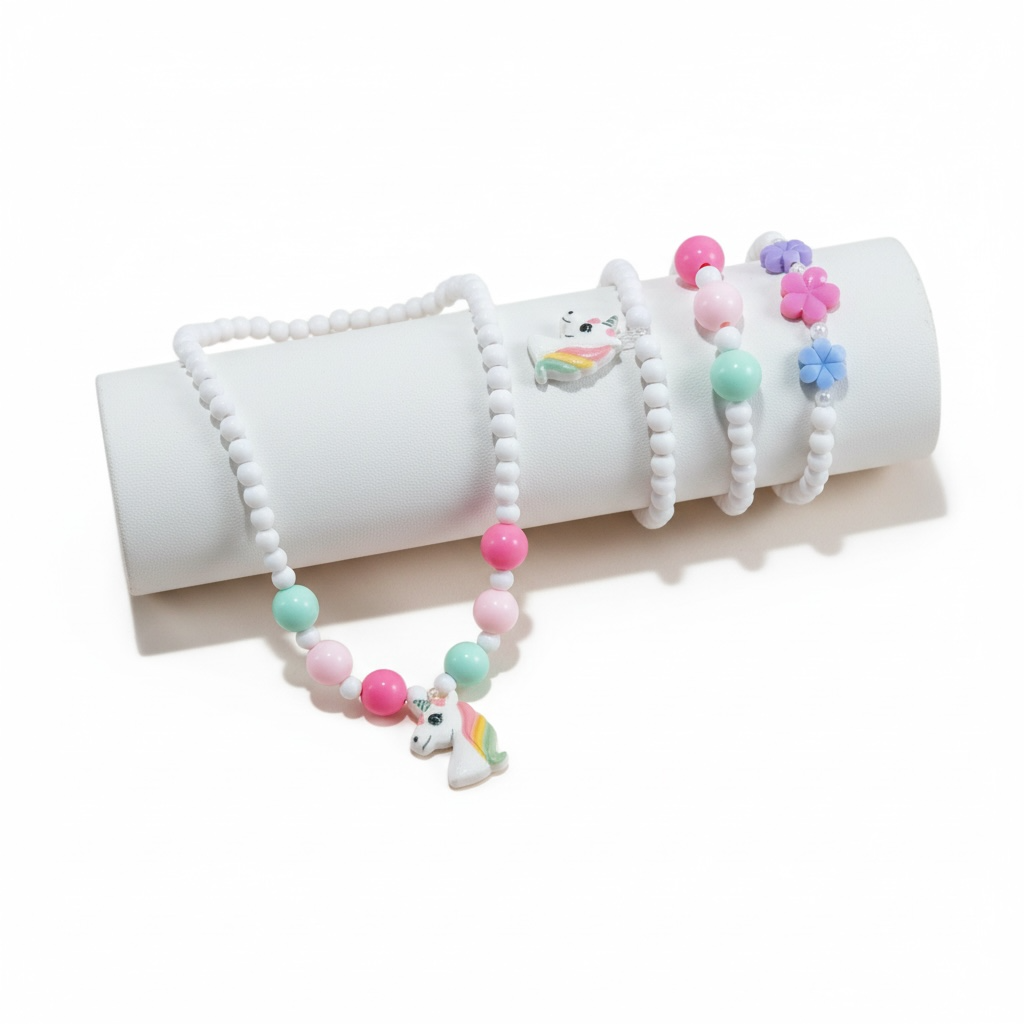 Forkæl dit barn med dette charmerende smykkesæt. Inkluderer et elegant halskæde med hvide perler og heste vedhæng samt tre farverige armbånd. Perfekt til leg og sjov.