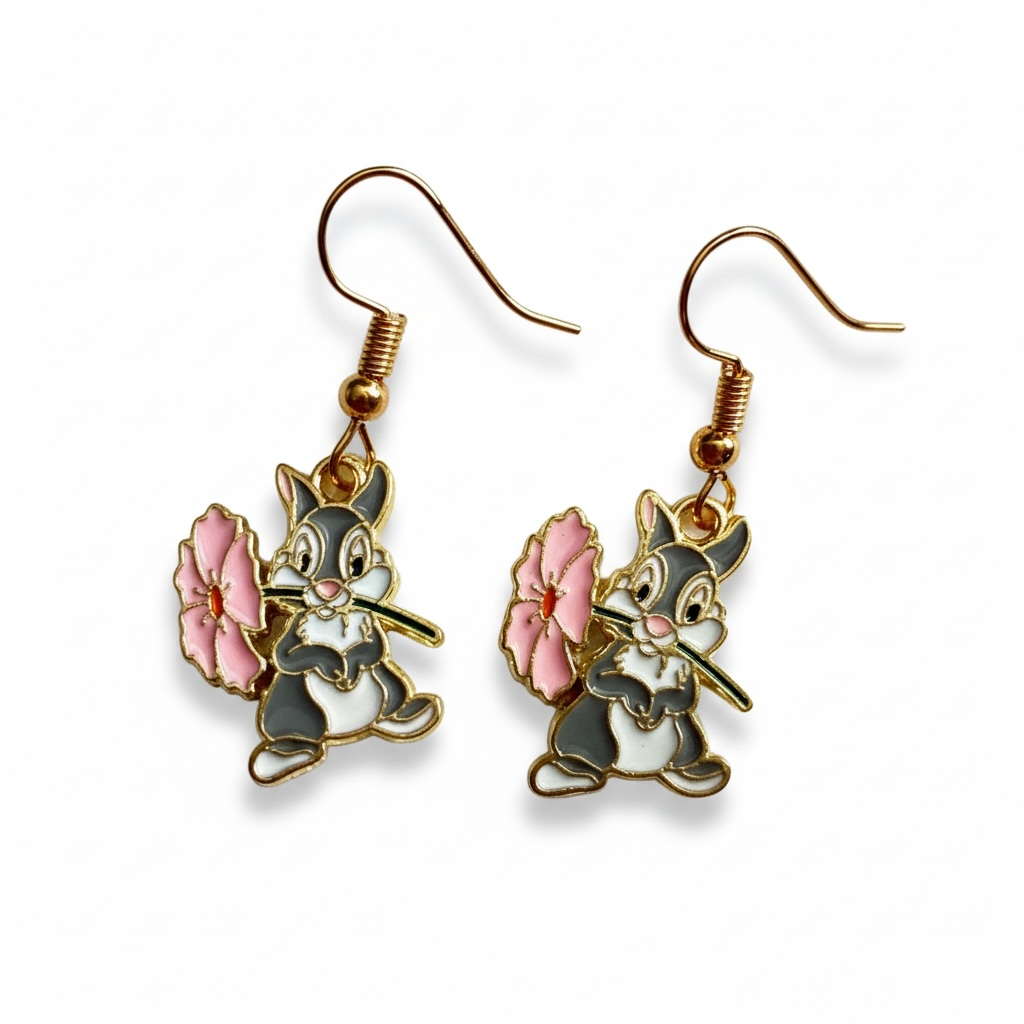 Søde og charmerende øreringe med en lille kanin, der holder en blomst i bløde rosa og grå nuancer. Det fine emaljedesign kombineret med guldfarvede detaljer giver et legende og nostalgisk udtryk, som tilfører personlighed og varme til dit look.
