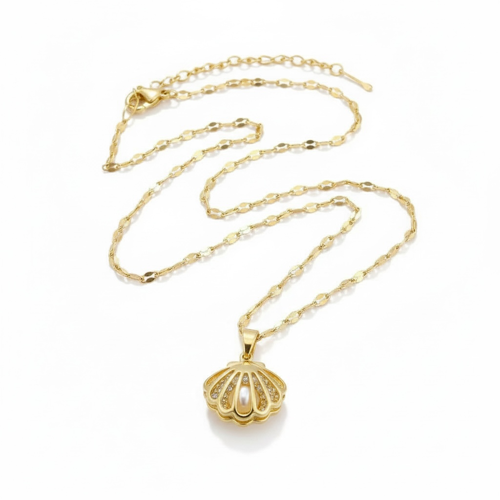 Opdag elegance med dette smukke halskæde, der præsenterer en muslingeskal med en glitrende perle indeni og funklende zirkoniasten, perfekt til enhver særlig lejlighed.