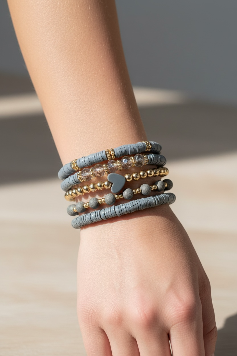 Elegant og moderne armbåndssæt bestående af 5 smukke armbånd i harmoniske grå og gyldne nuancer. Kombinationen af matte perler, funklende facetslebne sten og gyldne detaljer skaber et sofistikeret og stilfuldt udtryk.