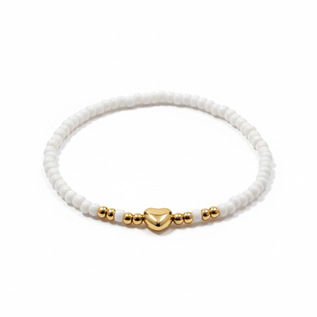 Elegant og tidløst armbånd i fine, hvide perler kombineret med et smukt guldfarvet hjerte og matchende detaljer. Det enkle design gør armbåndet perfekt til både hverdag og fest – og let at kombinere med andre smykker.