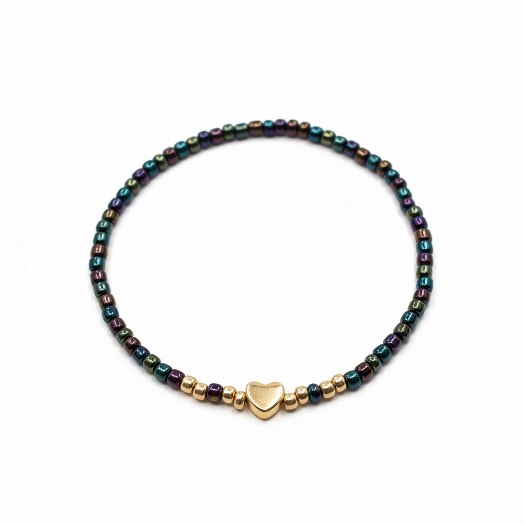 Smukt og levende armbånd i små, iriserende perler med et fint farvespil i grønne, blå og lilla nuancer. Det guldfarvede hjerte i midten skaber en elegant kontrast og giver armbåndet et eksklusivt og feminint udtryk.