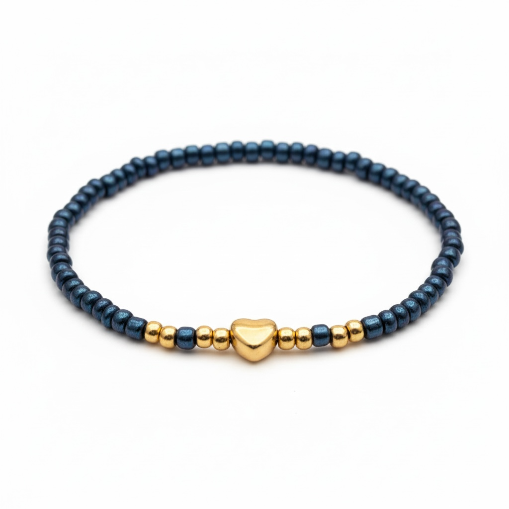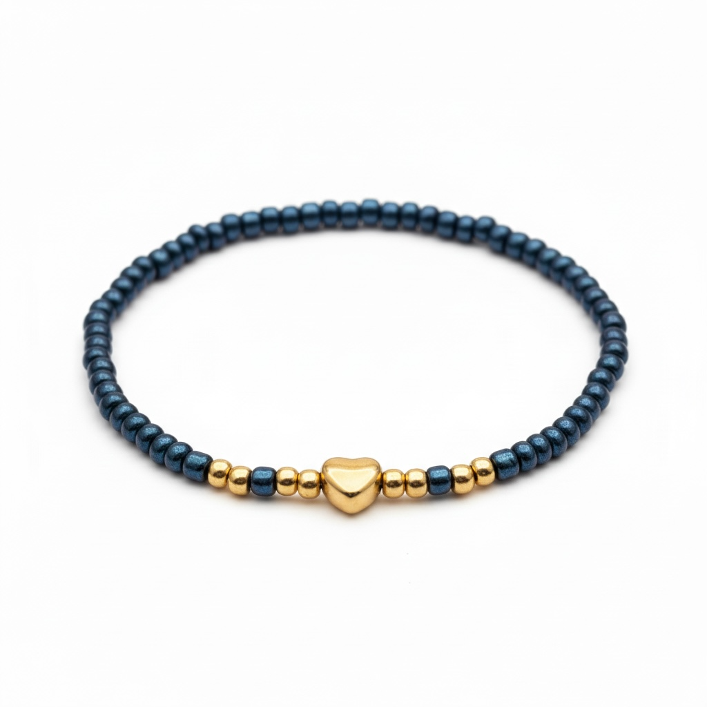 Elegant armbånd i dybe, blå perler kombineret med et smukt guldfarvet hjerte og fine gulddetaljer. Den blå farve giver et roligt og eksklusivt udtryk, mens hjertet tilfører varme og femininitet.