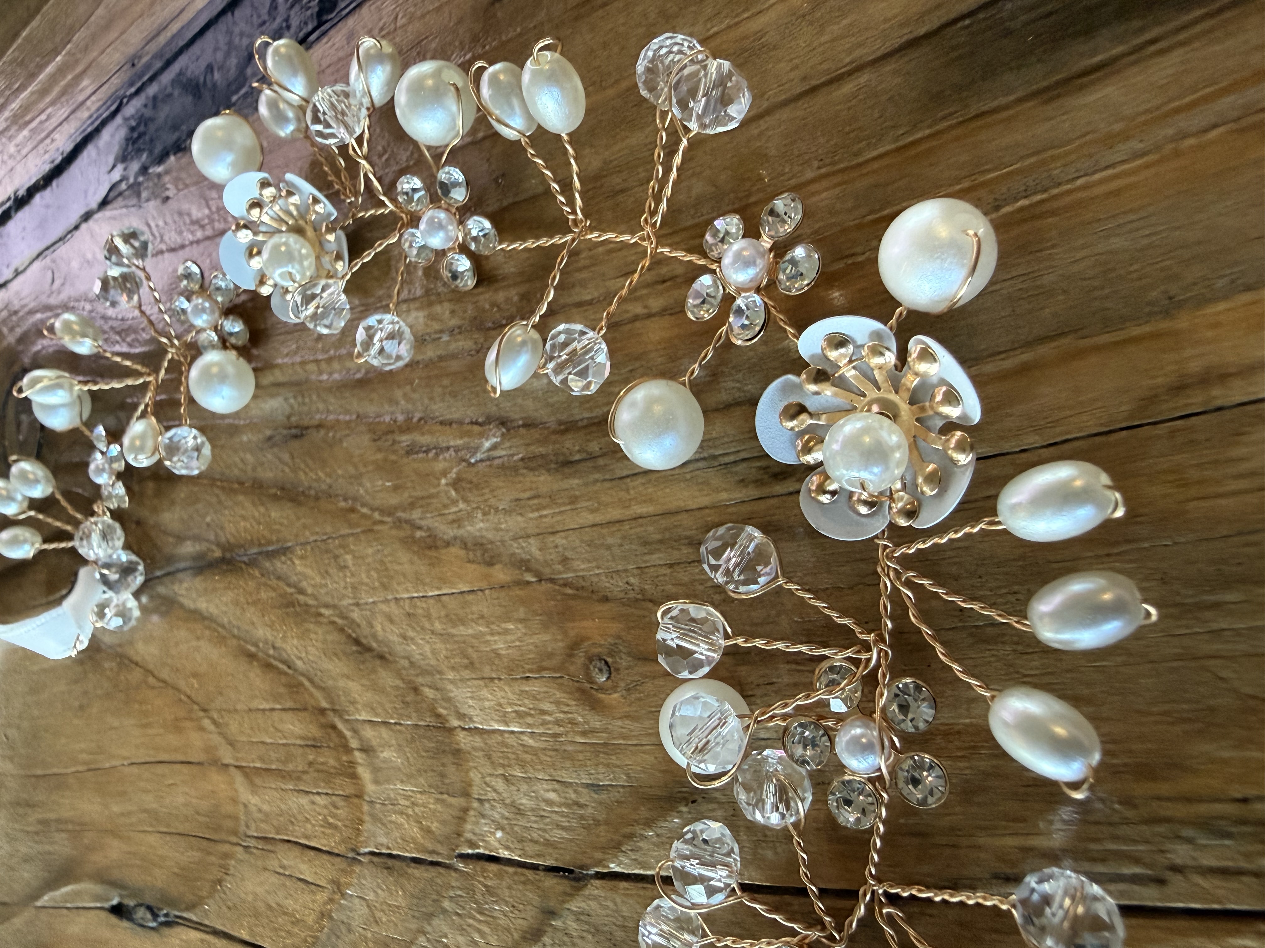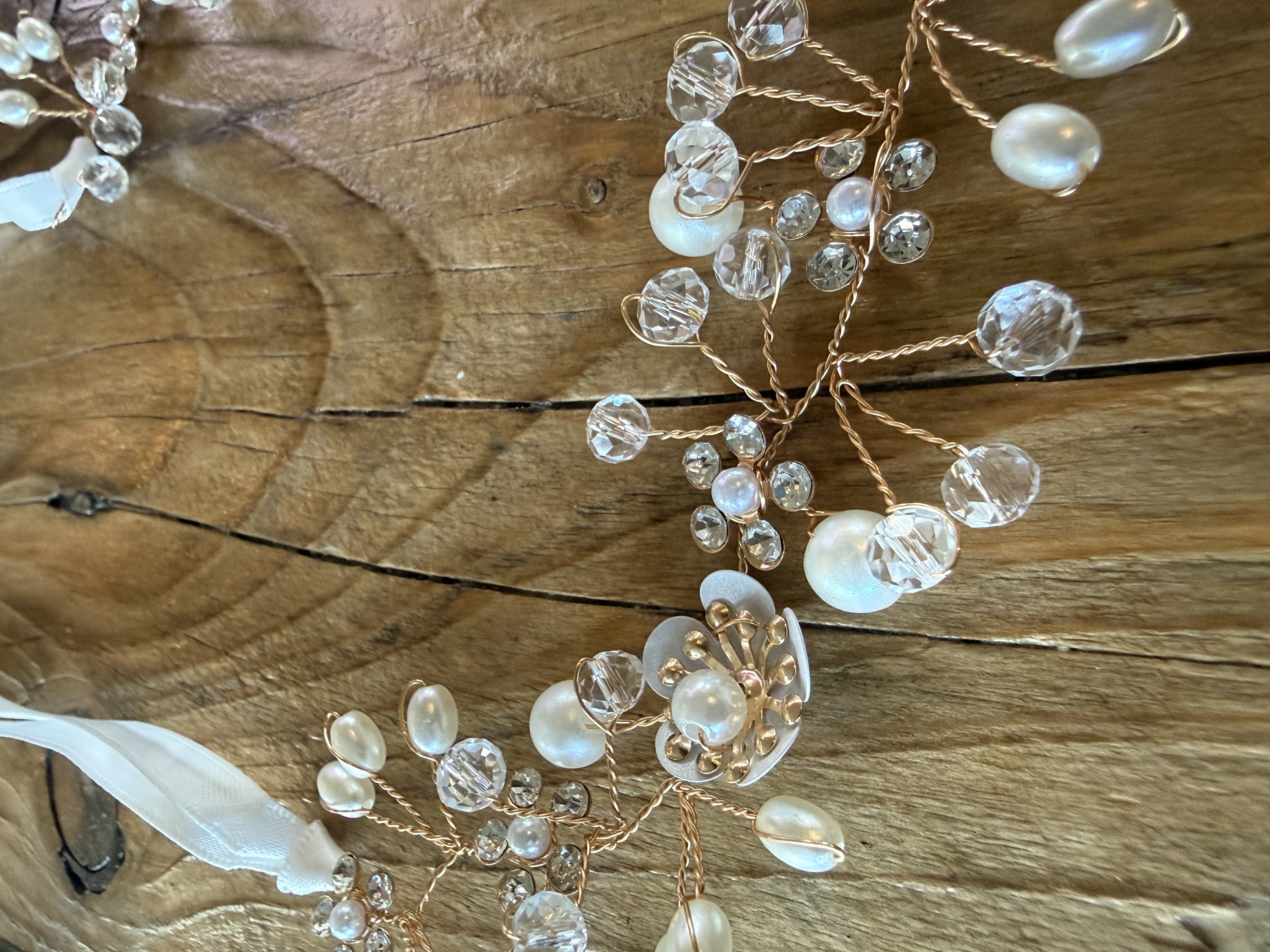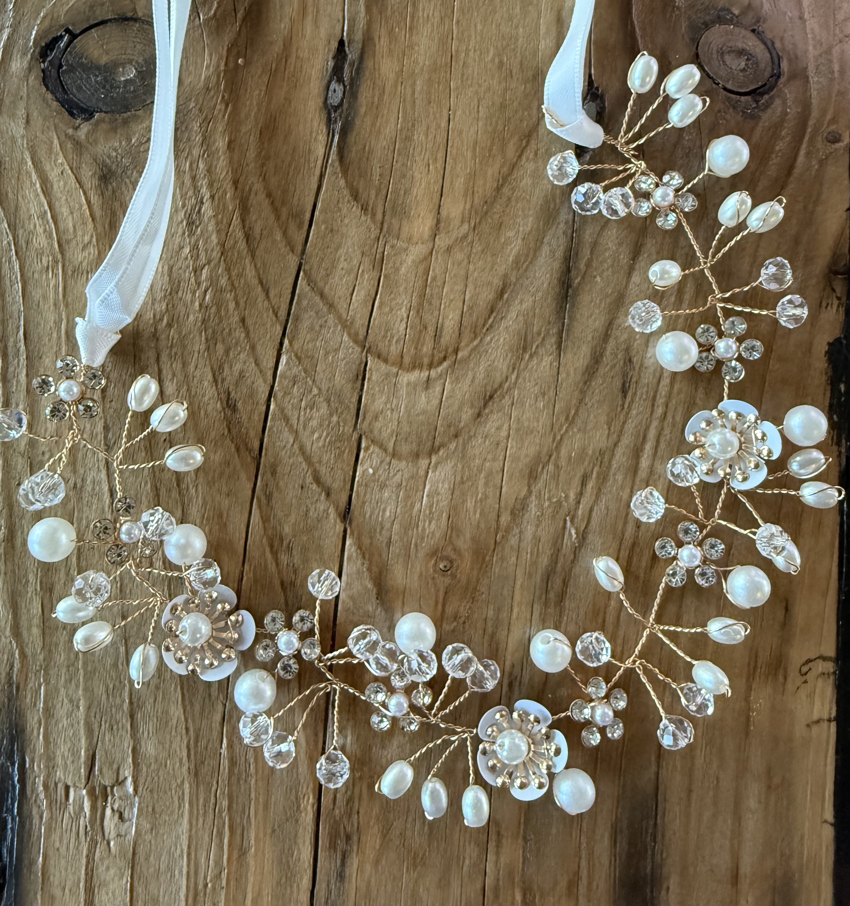 Smukt og feminint hårbånd håndlavet med perler og funklende krystaller på en gylden tråd. Det lette og fleksible design gør det nemt at forme, så det sidder perfekt i håret. Hårbåndet bindes med det medfølgende satinbånd og kan styles på flere måder.