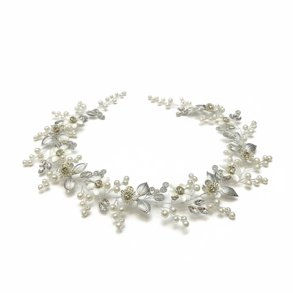Smukt og detaljerigt hårsmykke i sølvfarvet finish, udsmykket med fine blomster, perler og blade i et let og organisk design. Smykket følger hårets bevægelse og kan flettes ind i både opsætninger og løst hår for et harmonisk og romantisk udtryk.