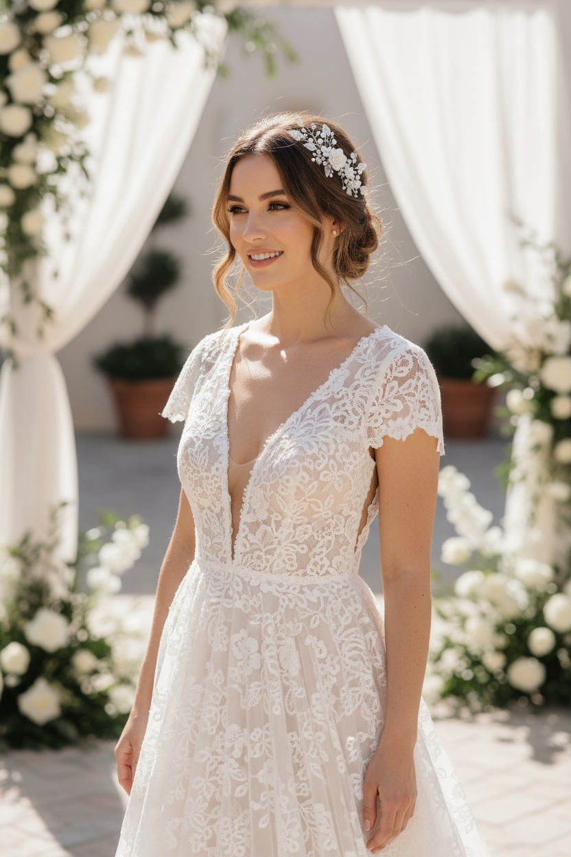 Smukt og detaljerigt hårsmykke dekoreret med hvide blomster, fine perler og dekorative blade i sølvfarvet finish. Det lette og organiske design giver et romantisk udtryk, der smukt fuldender både opsat og halvopsat hår.