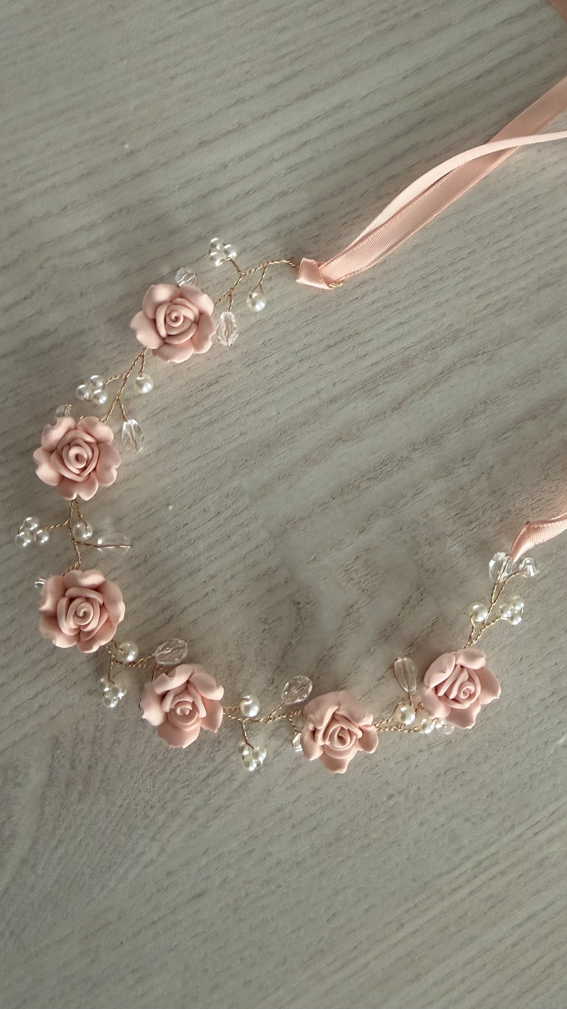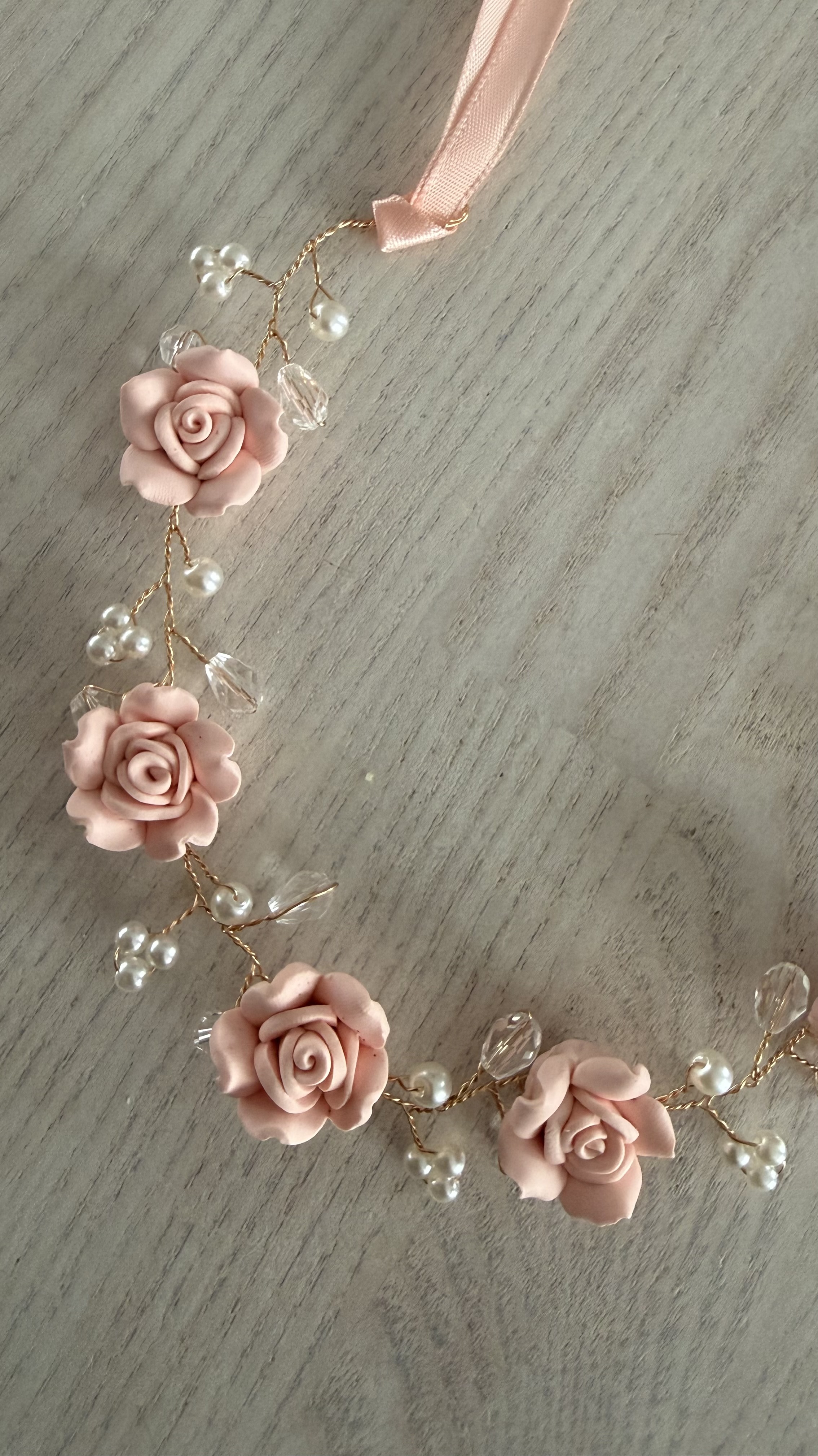 Smukt og feminint hårsmykke dekoreret med fine rosenblomster i støvet rosa, små perler og klare krystaldetaljer i et let og romantisk design. Smykket bindes med et blødt satinbånd, som giver et elegant og justerbart look.