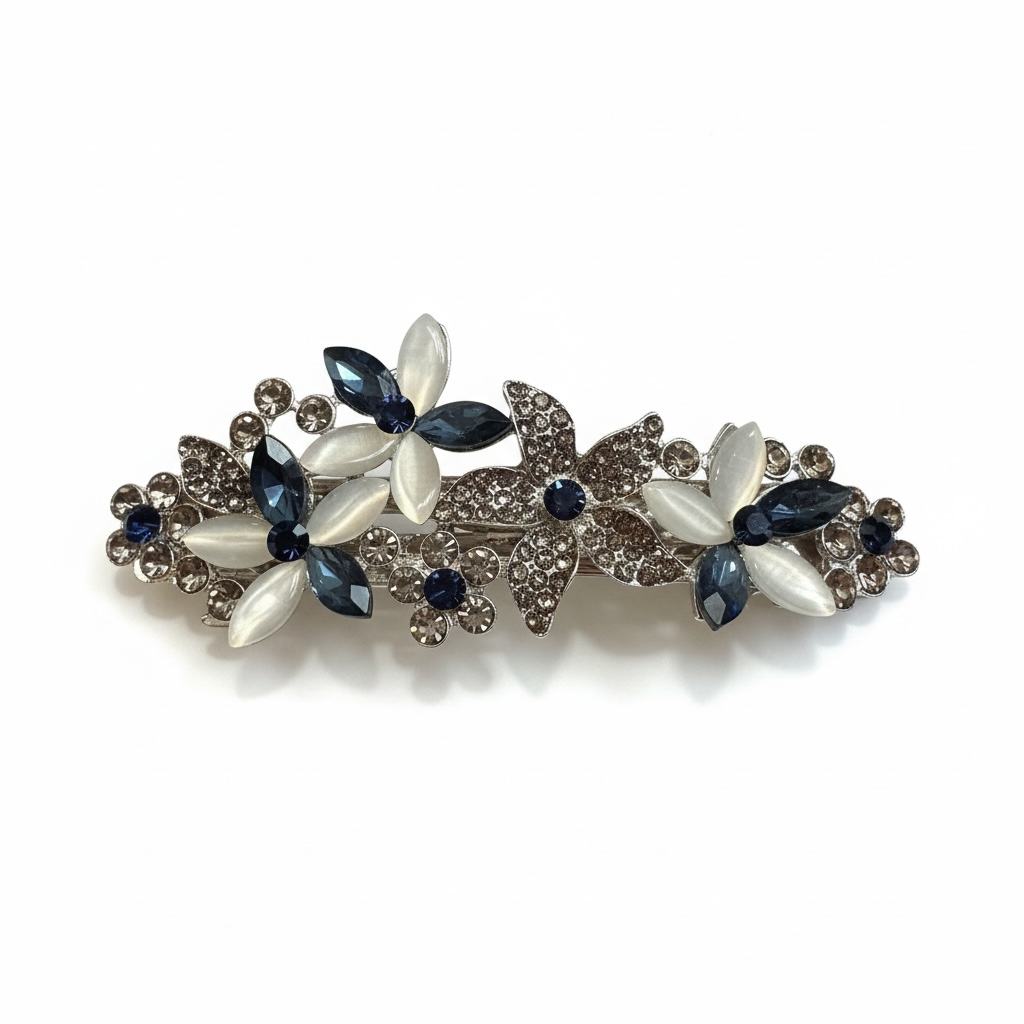 Oplev vores patenterede spænde, prydet med smuk blomst, rhinesten og blå farver, der tilføjer elegance og stil til enhver frisure. Perfekt til både fest og hverdag.
