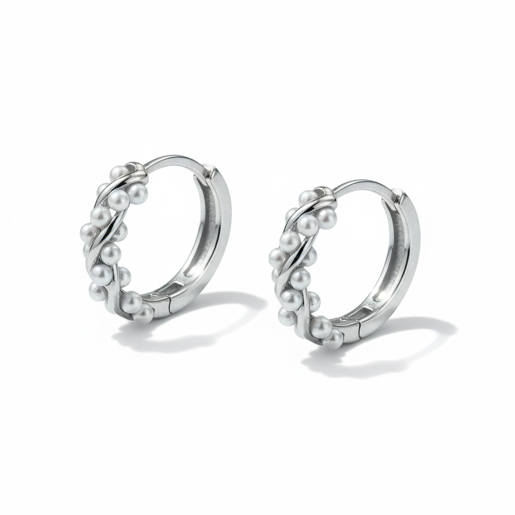Elegante og feminine hoop-øreringe i sølvfarvet finish, smukt dekoreret med fine små perler, der snoer sig rundt om ringen. Det detaljerede design giver et eksklusivt og romantisk udtryk, samtidig med at det bevarer et let og tidløst look.