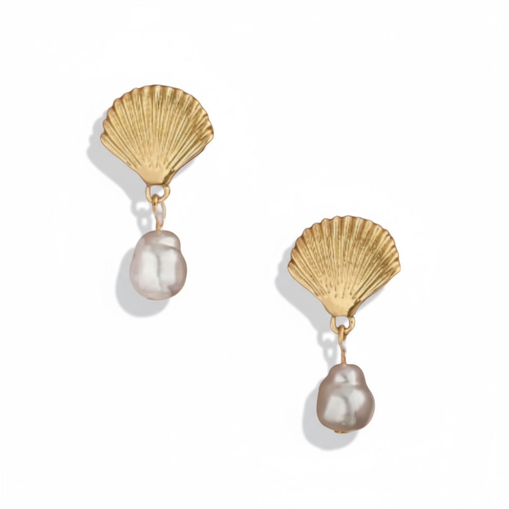 Disse elegante Øreringe med muslingeskal og hvide perler indfanger essensen af sommer. Perfekte til enhver anledning, de tilføjer et strejf af havets skønhed til dit look.