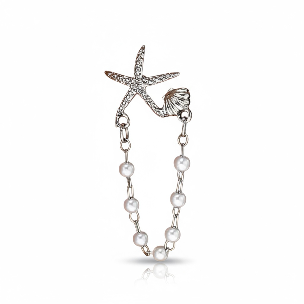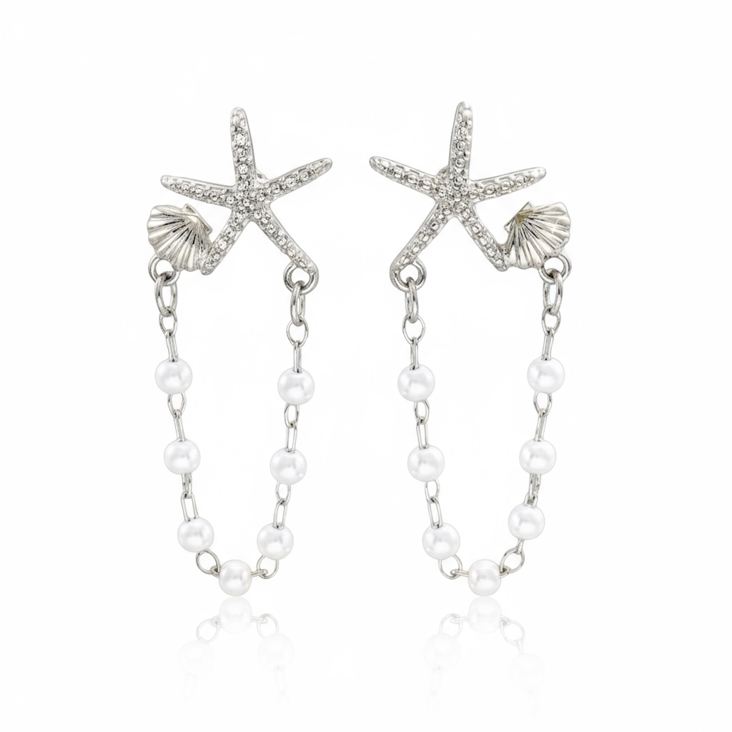 Disse elegante Øreringe med søstjerner og hvide perler indfanger essensen af sommer. Perfekte til enhver anledning, de tilføjer et strejf af havets skønhed til dit look.