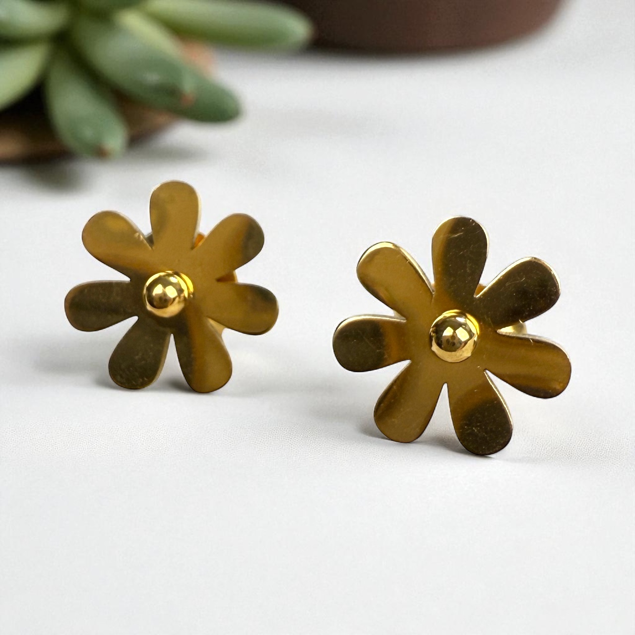 Præsentér din stil med disse søde, forgyldte ørestikker, prydet med en elegant, glat blomst. Ideelle til enhver lejlighed, de tilføjer et subtile touch af raffinement til din garderobe.