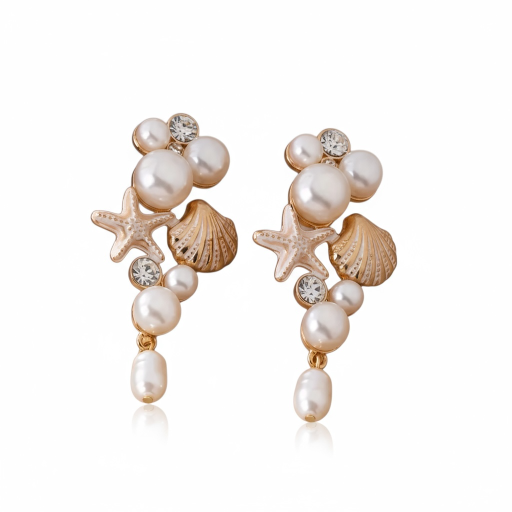 Disse elegante øreringe kombinerer strandskaller, søstjerner og fine hvide perler, hvilket skaber et tidløst strandlook, perfekt til enhver anledning. En luksuriøs tilføjelse til din smykkesamling.