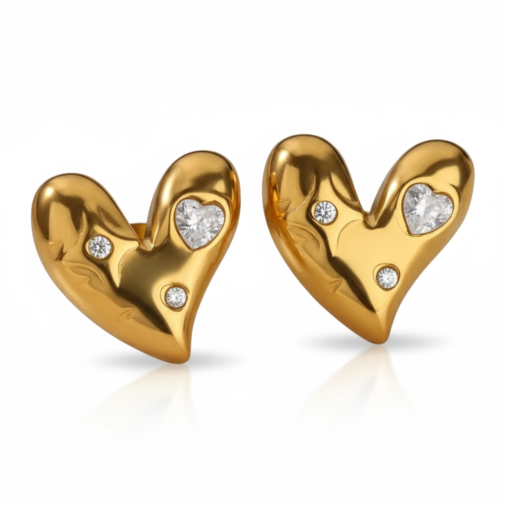 Disse forgyldte hjerte øreringe prydes med glitrende rhinesten, der tilføjer elegance og glamour til enhver outfit. Perfekt til både hverdag og festlige anledninger.