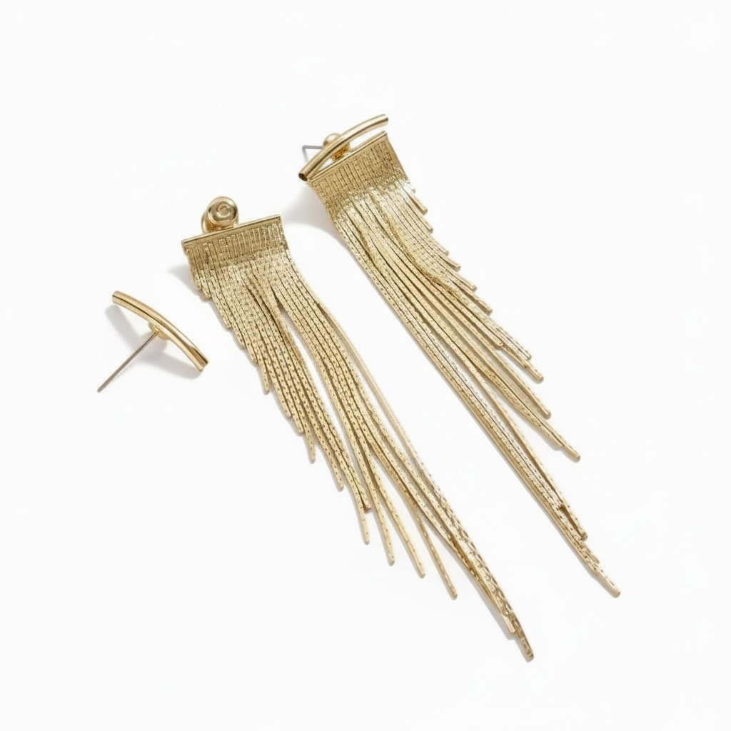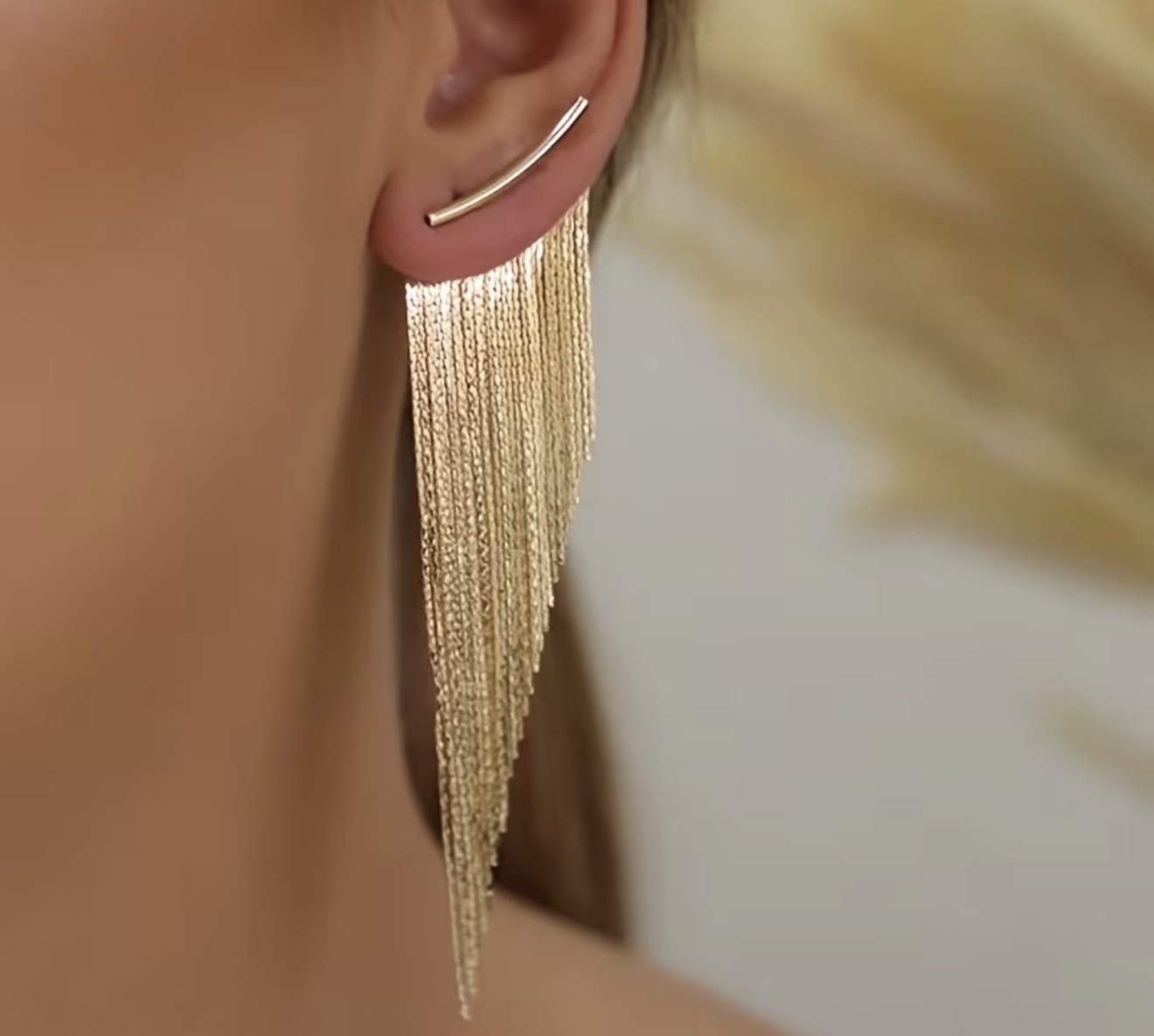 Tilføj et strejf af luksus til dit look med disse smukke, forgyldte kædeøreringe. Designet kombinerer et moderne, minimalistisk ørestykke med lange, draperende kæder, der bevæger sig let og elegant ved hvert skridt. Resultatet er et sofistikeret smykke, der både kan bæres til hverdag og til festlige anledninger.