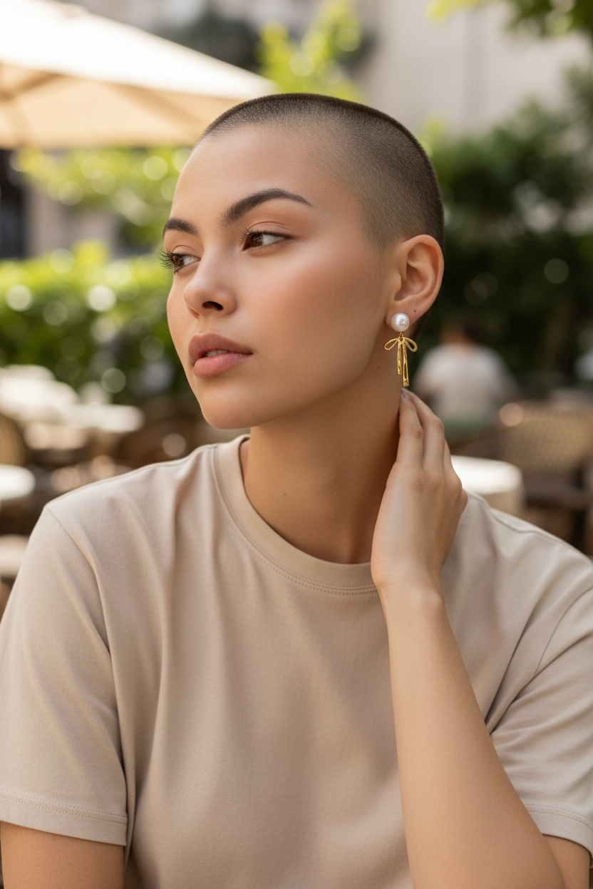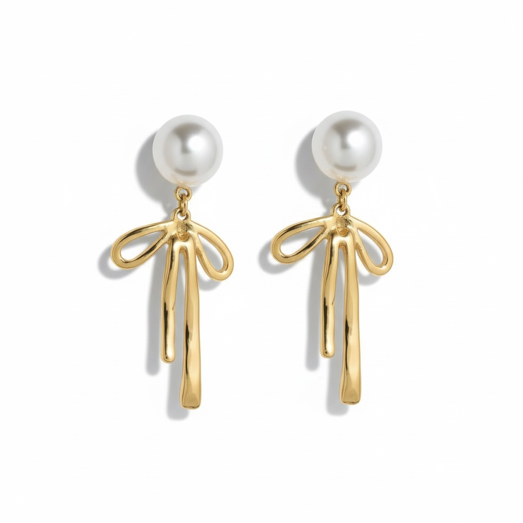 Disse smukke øreringe kombinerer klassisk perleelegance med et moderne, sculptural sløjfedesign i guldfinish. Et luksuriøst og romantisk smykke, der løfter ethvert outfit – perfekt til bryllup, fest eller som et sofistikeret hverdagsstatement.
