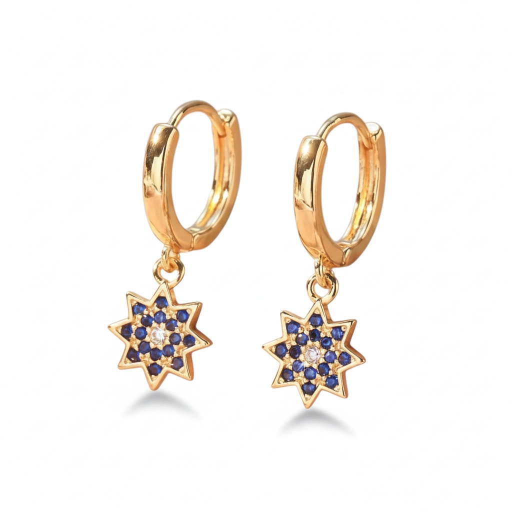 Elegante hoops i guldfinish med smukt stjernevedhæng dekoreret med blå og klare sten. Det fine og detaljerede design giver et eksklusivt og feminint udtryk, som både kan styles til hverdag og fest.