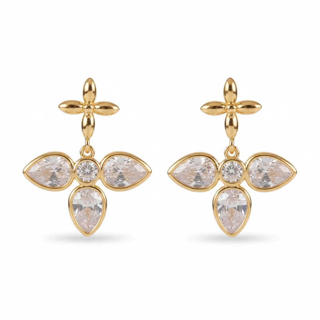 Sofistikerede og tidløse øreringe i eksklusiv gyldenfinish med funklende klare zirkonia sten. Det elegante korsinspirerede design kombinerer klassisk symbolik med moderne luksus og skaber et raffineret og feminint udtryk.