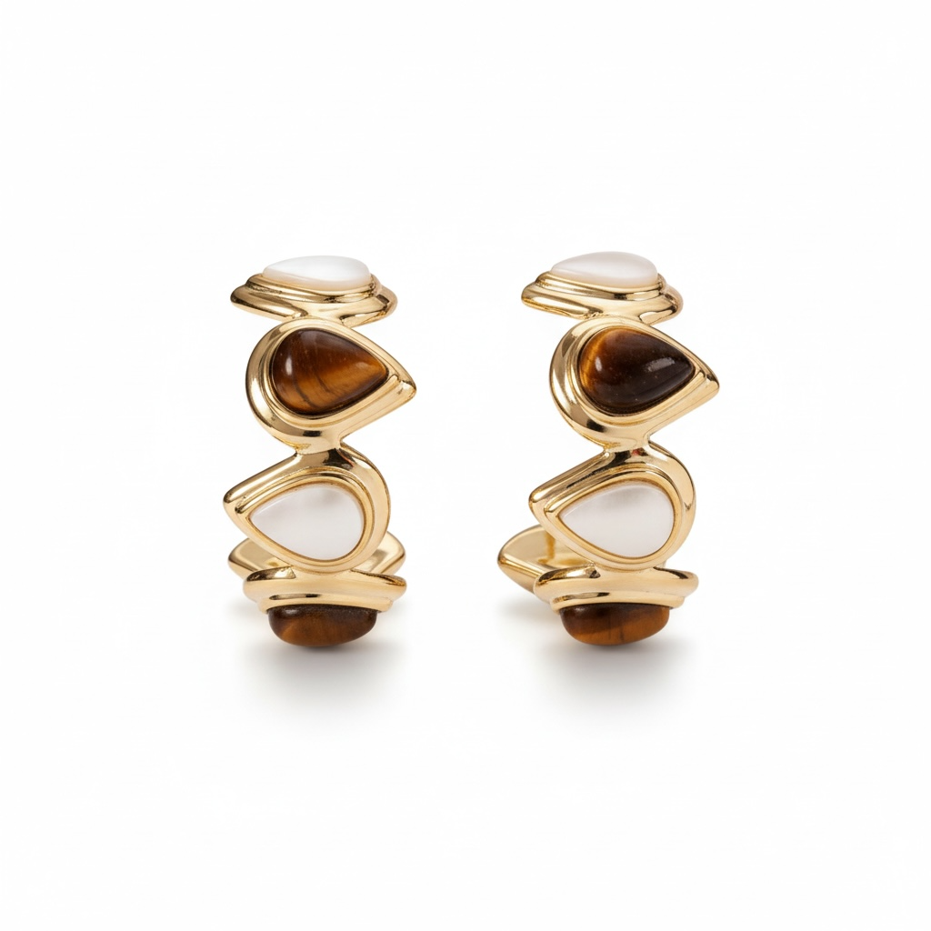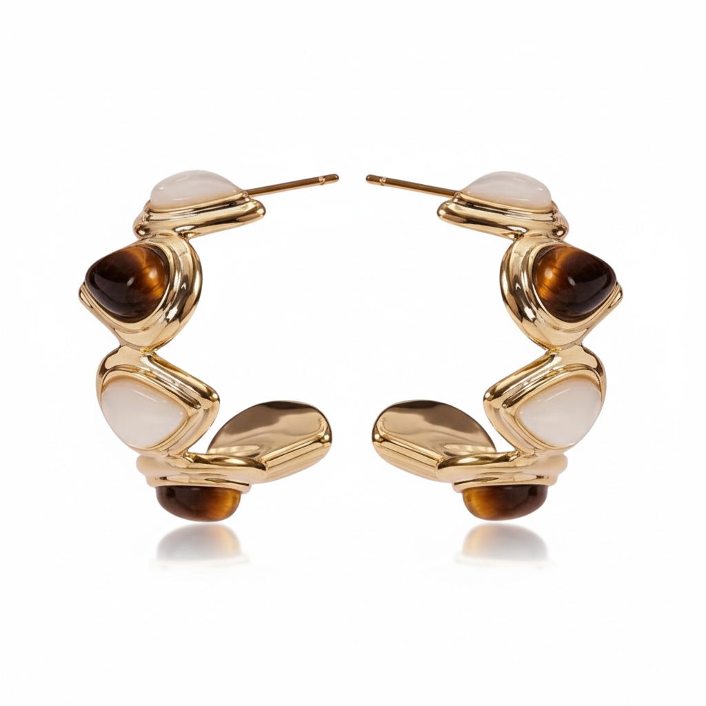 Sofistikerede øreringe i blank guldfinish med et skulpturelt og moderne formsprog. Designet kombinerer varme brune sten med lyse, bløde nuancer og skaber en elegant kontrast, der udstråler eksklusivitet og personlig stil.