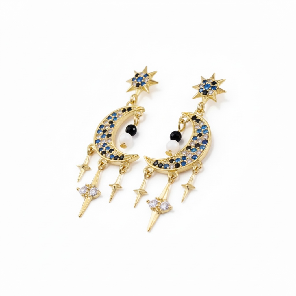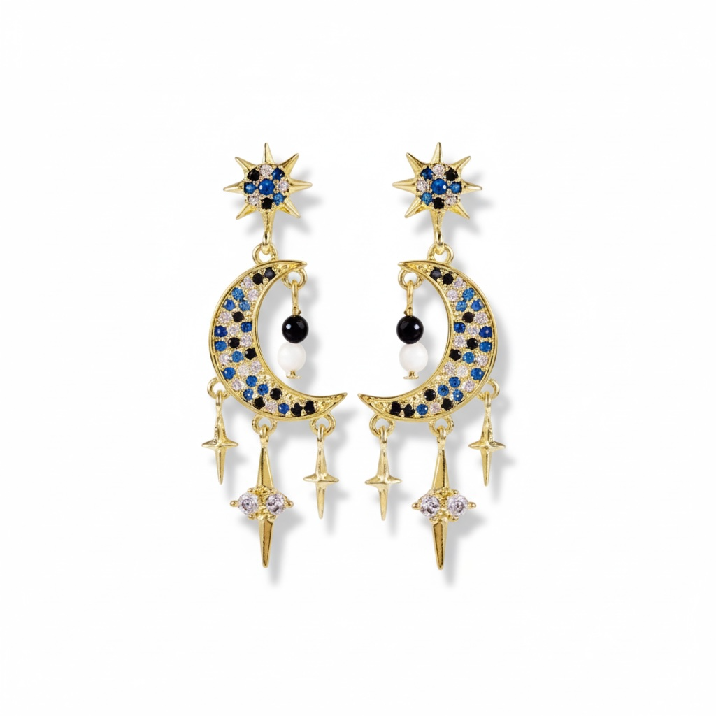 Magiske og iøjnefaldende øreringe i eksklusiv guldfinish med et detaljeret design af stjerne og halvmåne. De funklende blå og klare zirkonia sten skaber et smukt spil, mens de fine hængende stjernedetaljer tilfører bevægelse og elegance.