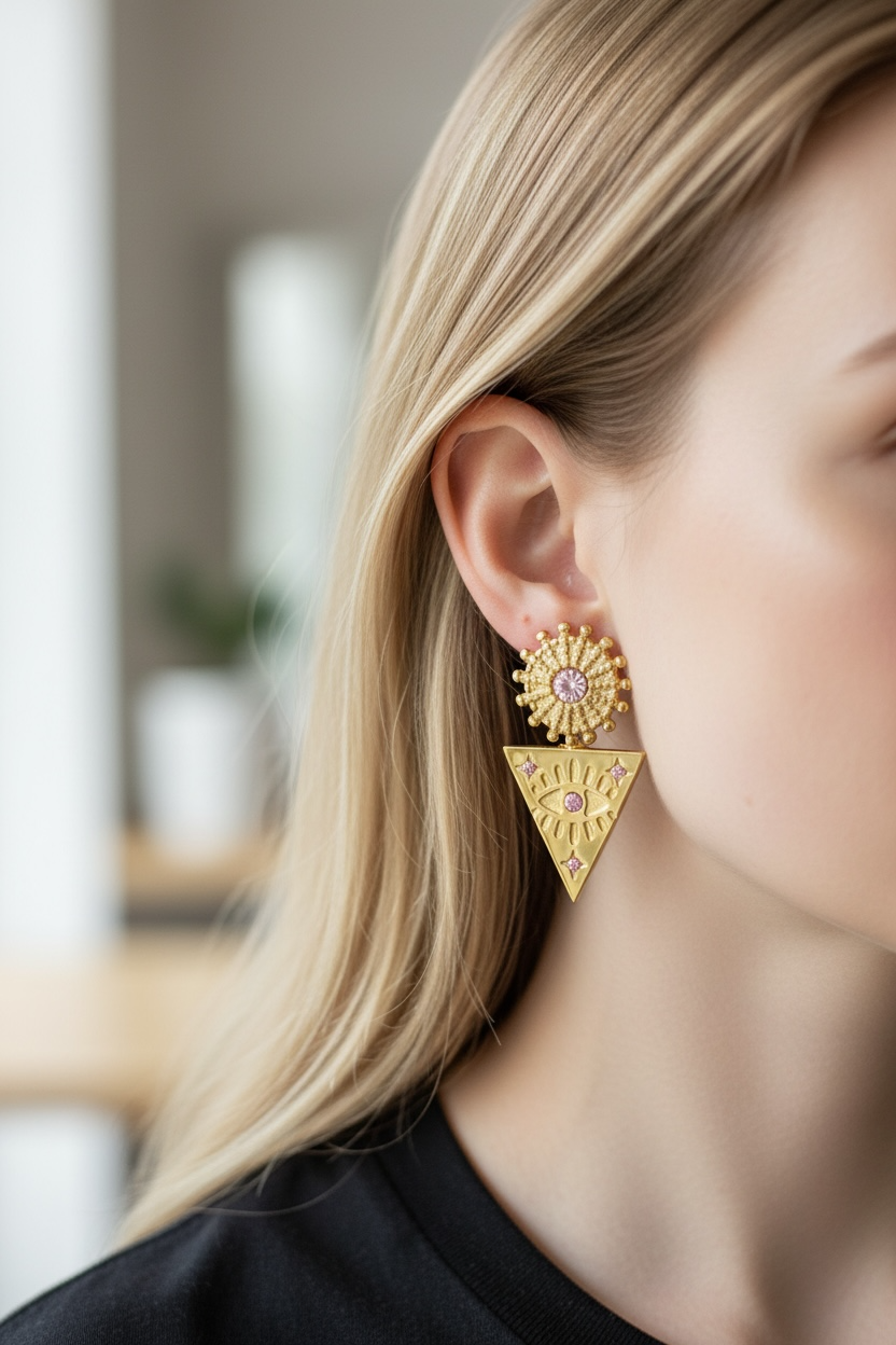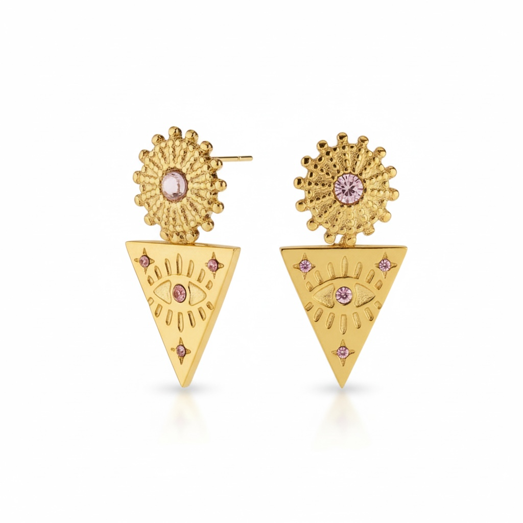 Markante og eksklusive øreringe i smuk guldfinish med detaljeret struktur og indfattede rosa zirkonia sten. Det unikke design kombinerer en dekorativ solform øverst med et trekantet vedhæng prydet af et stiliseret øjesymbol.