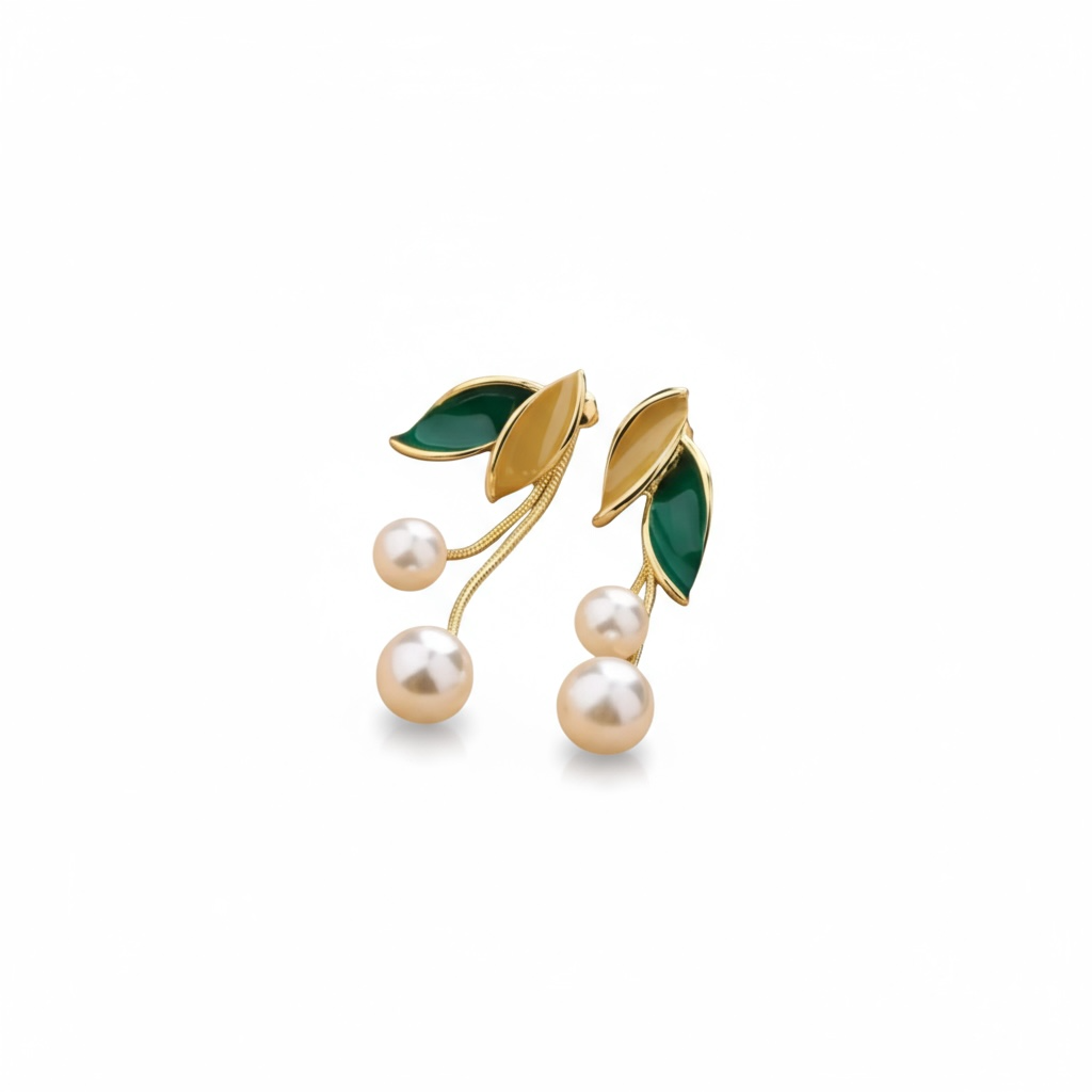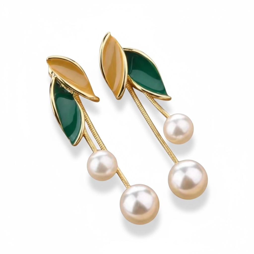 Disse forgyldte elegante øreringe kombinerer et kunstnerisk design af gul og grønt blad med hængende hvide perler, hvilket skaber en raffineret og let stil, perfekt til enhver lejlighed.