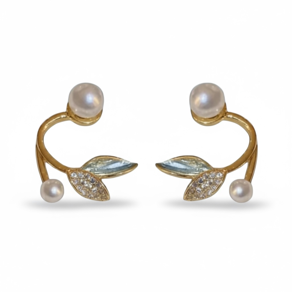 Oplev vores blad formede øreringe, der elegant former sig rundt om øret. Pyntet med klare hvide perler, blå blade og smukke klare sten. De tilbyder en tidløs skønhed og raffineret stil til enhver anledning.