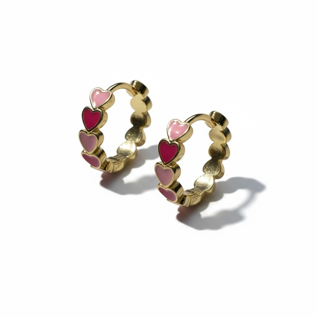 Opdag vores øreringe med de sødeste lyserøde hjerter. Perfekte til enhver lejlighed, de tilføjer et strejf af charme og stil til dit outfit.