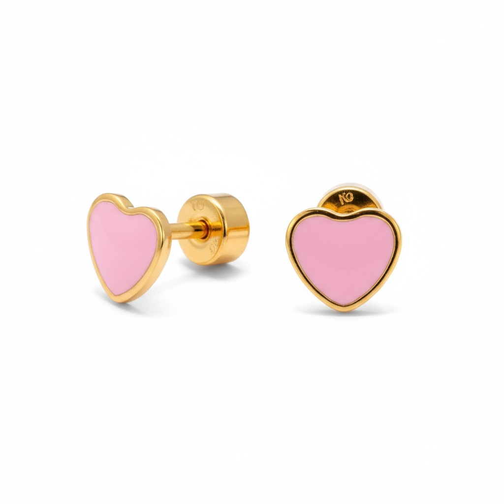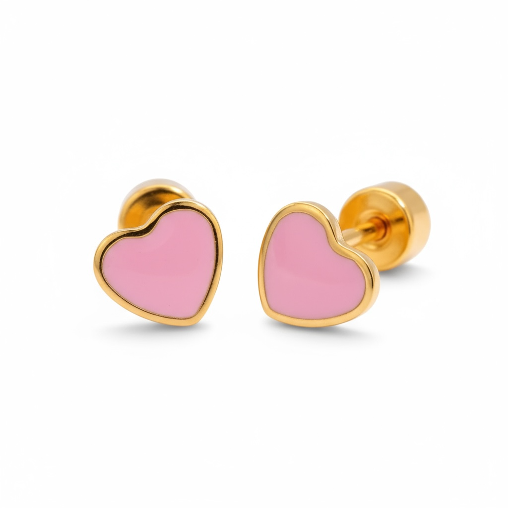 Disse små, søde øreringe prydes af lyserøde hjerter og har en sikker skrue lås bagpå. Nem at skrue af og på. Perfekt til enhver anledning.
